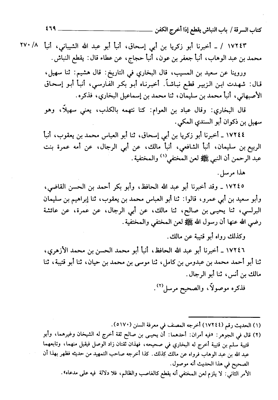 17243 - أَخْبَرَنَا أَبُو زَكَرِيَّا بْنُ أَبِي إِسْحَاقَ، أنبأ أَبُو عَبْدِ اللهِ الشَّيْبَانِيُّ، أنبأ مُحَمَّدُ بْنُ عَبْدِ الْوَهَّابِ، أنبأ جَعْفَرُ بْنُ عَوْنٍ، أنبأ حَجَّاجٌ، عَنْ عَطَاءٍ، قَالَ: " §يُقْطَعُ النَّبَّاشُ " وَرُوِّينَاه عَنْ سَعِيدِ بْنِ الْمُسَيِّبِ، قَالَ الْبُخَارِيُّ فِي التَّارِيخِ: قَالَ هُشَيْمٌ: ثنا سُهَيْلٌ قَالَ: شَهِدْتُ ابْنَ الزُّبَيْرِ قَطَعَ نَبَّاشًا: أَخْبَرَنَاهُ أَبُو بَكْرٍ الْفَارِسِيُّ، أَنْبَأَ أَبُو إِسْحَاقَ الْأَصْبَهَانِيُّ، أَنْبَأَ مُحَمَّدُ بْنُ سُلَيْمَانَ، ثنا مُحَمَّدُ بْنُ إِسْمَاعِيلَ الْبُخَارِيُّ، فَذَكَرَهُ قَالَ الْبُخَارِيُّ: وَقَالَ عَبَّادُ بْنُ الْعَوَّامِ: كُنَّا نَتَّهِمُهُ بِالْكَذِبِ، يَعْنِي سُهَيْلًا وَهُوَ سُهَيْلُ بْنُ ذَكْوَانَ أَبُو السِّنْدِيِّ الْمَكِّيُّ