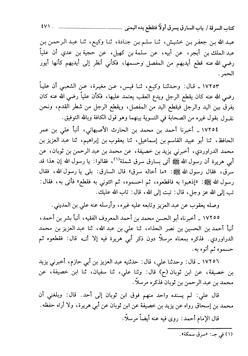 17254 - أَخْبَرَنَا أَحْمَدُ بْنُ مُحَمَّدِ بْنِ الْحَارِثِ الْأَصْبَهَانِيُّ، أنبأ عَلِيُّ بْنُ عُمَرَ الْحَافِظُ، ثنا أَبُو عُبَيْدٍ الْقَاسِمُ بْنُ إِسْمَاعِيلَ، ثنا يَعْقُوبُ بْنُ إِبْرَاهِيمَ، ثنا عَبْدُ الْعَزِيزِ بْنُ مُحَمَّدٍ الدَّرَاوَرْدِيُّ، أَخْبَرَنِي يَزِيدُ بْنُ خُصَيْفَةَ، عَنْ مُحَمَّدِ بْنِ عَبْدِ الرَّحْمَنِ بْنِ ثَوْبَانَ، عَنْ أَبِي هُرَيْرَةَ، أَنَّ رَسُولَ اللهِ صَلَّى اللهُ عَلَيْهِ وَسَلَّمَ أُتِيَ بِسَارِقٍ سَرَقَ شَمْلَةً فَقَالُوا: يَا رَسُولَ اللهِ إِنَّ هَذَا قَدْ سَرَقَ، فَقَالَ رَسُولُ اللهِ صَلَّى اللهُ عَلَيْهِ وَسَلَّمَ: " مَا إِخَالُهُ سَرَقَ " , قَالَ السَّارِقُ: بَلَى يَا رَسُولَ اللهِ، فَقَالَ رَسُولُ اللهِ صَلَّى اللهُ عَلَيْهِ وَسَلَّمَ: §" اذْهَبُوا بِهِ فَاقْطَعُوهُ , ثُمَّ احْسِمُوهُ , ثُمَّ ائْتُونِي بِهِ , فَقُطِعَ فَأُتِيَ بِهِ، فَقَالَ: " تُبْ إِلَى اللهِ عَزَّ وَجَلَّ " , قَالَ: تُبْتُ إِلَى اللهِ , قَالَ: " تَابَ اللهُ عَلَيْكَ " وَصَلَهُ يَعْقُوبُ عَنْ عَبْدِ الْعَزِيزِ , وَتَابَعَهُ عَلَيْهِ غَيْرُهُ , وَأَرْسَلَهُ عَنْهُ عَلِيُّ بْنُ الْمَدِينِيِّ