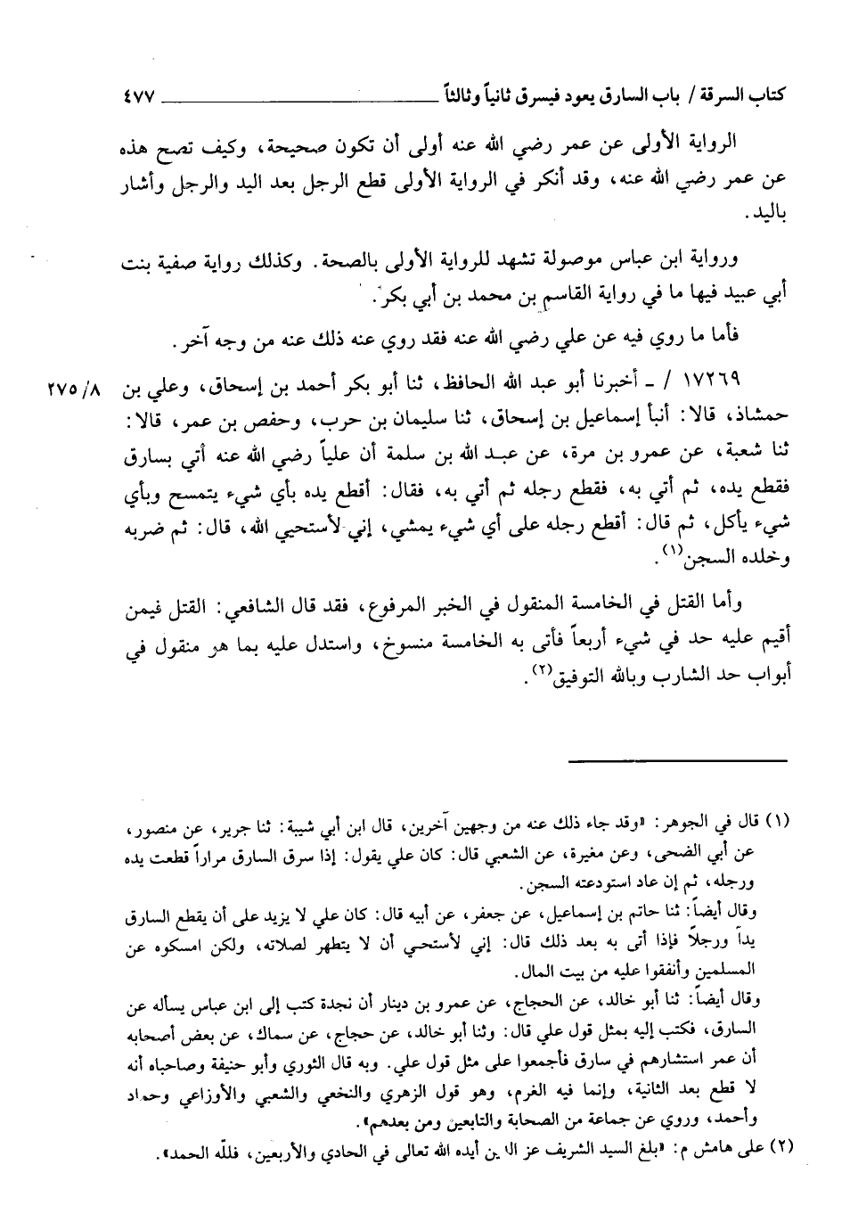 17269 - أَخْبَرَنَاهُ أَبُو عَبْدِ اللهِ الْحَافِظُ، ثنا أَبُو بَكْرٍ أَحْمَدُ بْنُ إِسْحَاقَ وَعَلِيُّ بْنُ حَمْشَاذٍ , قَالَا: أنبأ إِسْمَاعِيلُ بْنُ إِسْحَاقَ، ثنا سُلَيْمَانُ بْنُ حَرْبٍ، وَحَفْصُ بْنُ عُمَرَ، قَالَا: ثنا شُعْبَةُ، عَنْ عَمْرِو بْنِ مُرَّةَ، عَنْ عَبْدِ اللهِ بْنِ سَلَمَةَ، أَنَّ عَلِيًّا، رَضِيَ اللهُ عَنْهُ §" أُتِيَ بِسَارِقٍ فَقَطَعَ يَدَهُ , ثُمَّ أُتِيَ بِهِ فَقَطَعَ رِجْلَهُ , ثُمَّ أُتِيَ بِهِ فَقَالَ: أَقْطَعُ يَدَهُ , بِأِيِّ شَيْءٍ يَتَمَسَّحُ , وَبِأِيِّ شَيْءٍ يَأْكُلُ؟ ثُمَّ قَالَ: أَقْطَعُ رِجْلَهُ , عَلَى أِيِّ شَيْءٍ يَمْشِي؟ إِنِّي لَأَسْتَحْيِي اللهَ , قَالَ: ثُمَّ ضَرَبَهُ وَخَلَّدَهُ السِّجْنَ " وَأَمَّا الْقَتْلُ فِي الْخَامِسَةِ الْمَنْقُولُ فِي الْخَبَرِ الْمَرْفُوعِ , فَقَدْ قَالَ الشَّافِعِيُّ: الْقَتْلُ فِيمَنْ أُقِيمَ عَلَيْهِ حَدٌّ فِي شَيْءٍ أَرْبَعًا فَأَتَى بِهِ الْخَامِسَةَ مَنْسُوخٌ , وَاسْتَدَلَّ عَلَيْهِ بِمَا هُوَ مَنْقُولٌ فِي أَبْوَابِ حَدِّ الشَّارِبِ , وَبِاللهِ التَّوْفِيقُ