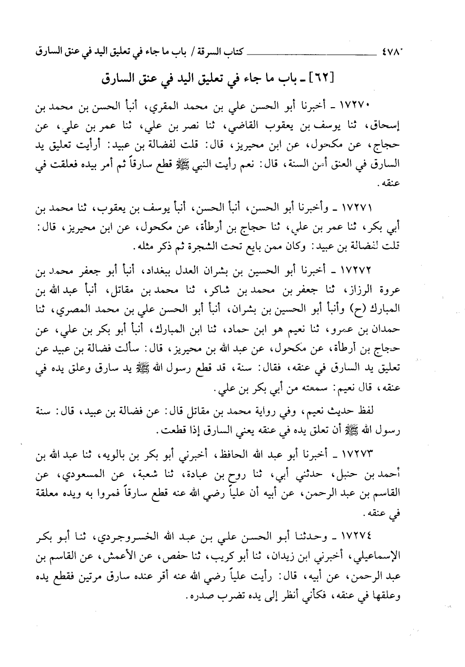17272 - أَخْبَرَنَا أَبُو الْحُسَيْنِ بْنُ بِشْرَانَ الْعَدْلُ، بِبَغْدَادَ , أنبأ أَبُو جَعْفَرٍ مُحَمَّدُ بْنُ عَمْرٍو الرَّزَّازُ , ثنا جَعْفَرُ بْنُ مُحَمَّدِ بْنِ شَاكِرٍ، ثنا مُحَمَّدُ بْنُ مُقَاتِلٍ، أنبأ عَبْدُ اللهِ بْنُ الْمُبَارَكِ، ح وَأنبأ أَبُو الْحُسَيْنِ بْنُ بِشْرَانَ، أنبأ أَبُو الْحَسَنِ عَلِيُّ بْنُ مُحَمَّدٍ الْمِصْرِيُّ , ثنا حِمْدَانُ بْنُ عَمْرٍو، ثنا نُعَيْمٌ هُوَ ابْنُ حَمَّادٍ , ثنا ابْنُ الْمُبَارَكِ، أنبأ أَبُو بَكْرِ بْنُ عَلِيٍّ، عَنْ حَجَّاجِ بْنِ أَرْطَاةَ، عَنْ مَكْحُولٍ، عَنْ عَبْدِ اللهِ بْنِ مُحَيْرِيزٍ، قَالَ: سَأَلْتُ فَضَالَةَ بْنَ عُبَيْدٍ عَنْ تَعْلِيقِ، يَدِ السَّارِقِ فِي عُنُقِهِ، فَقَالَ: سُنَّةٌ , §" قَدْ قَطَعَ رَسُولُ اللهِ صَلَّى اللهُ عَلَيْهِ وَسَلَّمَ يَدَ سَارِقٍ وَعَلَّقَ يَدَهُ فِي عُنُقِهِ , قَالَ نُعَيْمٌ: سَمِعْتُهُ مِنْ أَبِي بَكْرِ بْنِ عَلِيٍّ لَفْظُ حَدِيثِ نُعَيْمٍ , وَفِي رِوَايَةِ مُحَمَّدِ بْنِ مُقَاتِلٍ قَالَ: عَنْ فَضَالَةَ بْنِ عُبَيْدٍ قَالَ: سُنَّةُ رَسُولِ اللهِ صَلَّى اللهُ عَلَيْهِ وَسَلَّمَ أَنْ تُعَلَّقَ يَدُهُ فِي عُنُقِهِ , يَعْنِي السَّارِقَ إِذَا قُطِعَتْ