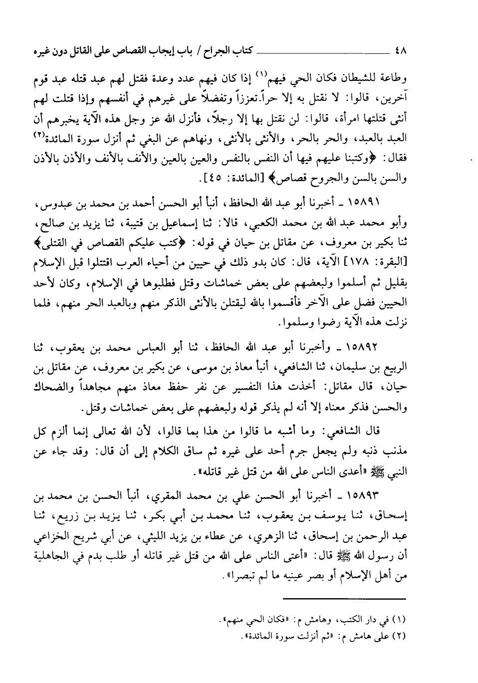 15891 - أَخْبَرَنَا أَبُو عَبْدِ اللهِ الْحَافِظُ، أنبأ أَبُو الْحَسَنِ أَحْمَدُ بْنُ مُحَمَّدِ بْنِ عُبْدُوسٍ، وَأَبُو مُحَمَّدٍ عَبْدُ اللهِ بْنُ مُحَمَّدٍ الْكَعْبِيُّ، قَالَا: ثنا إِسْمَاعِيلُ بْنُ قُتَيْبَةَ، ثنا يَزِيدُ بْنُ صَالِحٍ، ثنا بُكَيْرُ بْنُ مَعْرُوفٍ، عَنْ مُقَاتِلِ بْنِ حَيَّانَ، فِي قَوْلِهِ: {§كُتِبَ عَلَيْكُمُ الْقِصَاصُ فِي الْقَتْلَى} [البقرة: 178]، الْآيَةَ، قَالَ: كَانَ بُدُوُّ ذَلِكَ فِي حَيَّيْنِ مِنْ أَحْيَاءِ الْعَرَبِ اقْتَتَلُوا قَبْلَ الْإِسْلَامِ بِقَلِيلٍ، ثُمَّ أَسْلَمُوا وَلِبَعْضِهِمْ عَلَى بَعْضٍ خُمَاشَاتٌ وَقَتْلٌ، فَطَلَبُوهَا فِي الْإِسْلَامِ، وَكَانَ لِأَحَدِ الْحَيَّيْنِ فَضْلٌ عَلَى الْآخَرِ فَأَقْسَمُوا بِاللهِ لَيُقْتَلَنَّ بِالْأُنْثَى الذَّكَرُ مِنْهُمْ، وَبِالْعَبْدِ الْحُرُّ مِنْهُمْ. فَلَمَّا نَزَلَتْ هَذِهِ الْآيَةُ رَضُوا وَسَلَّمُوا