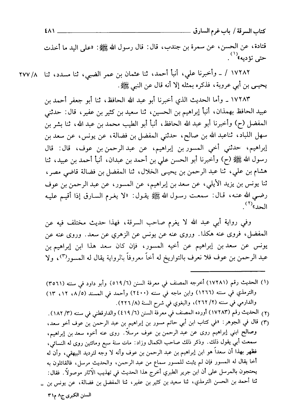 17283 - وَأَمَّا الْحَدِيثُ الَّذِي أَخْبَرَنَا أَبُو عَبْدِ اللهِ الْحَافِظُ، ثنا أَبُو جَعْفَرٍ أَحْمَدُ بْنُ عُبَيْدٍ الْحَافِظُ بِهَمَذَانَ , أنبأ إِبْرَاهِيمُ بْنُ الْحُسَيْنِ، ثنا سَعِيدُ بْنُ كَثِيرِ بْنِ عُفَيْرٍ، قَالَ: حَدَّثَنِي الْمُفَضَّلُ، ح وَأَخْبَرَنَا أَبُو عَبْدِ اللهِ الْحَافِظُ، أنبأ أَبُو الطِّيبِ مُحَمَّدُ بْنُ عَبْدِ اللهِ , ثنا بِشْرُ بْنُ سَهْلٍ اللَّبَّادُ، ثنا عَبْدُ اللهِ بْنُ صَالِحٍ، حَدَّثَنِي الْمُفَضَّلُ بْنُ فَضَالَةَ، عَنْ يُونُسَ، عَنْ سَعْدِ بْنِ إِبْرَاهِيمَ، حَدَّثَنِي أَخِي الْمِسْوَرُ بْنُ إِبْرَاهِيمَ، عَنْ عَبْدِ الرَّحْمَنِ بْنِ عَوْفٍ، قَالَ: قَالَ رَسُولُ اللهِ صَلَّى اللهُ عَلَيْهِ وَسَلَّمَ: ح وَأَخْبَرَنَا أَبُو الْحَسَنِ عَلِيُّ بْنُ أَحْمَدَ بْنِ عَبْدَانَ , أنبأ أَحْمَدُ بْنُ عُبَيْدٍ , ثنا هِشَامُ بْنُ عَلِيٍّ , ثنا عَبْدُ الرَّحْمَنِ بْنُ يَحْيَى الْخَلَّالُ , ثنا الْمُفَضَّلُ بْنُ فَضَالَةَ قَاضِي مِصْرَ , ثنا يُونُسُ بْنُ يَزِيدَ الْأَيْلِيُّ، عَنْ سَعْدِ بْنِ إِبْرَاهِيمَ، عَنِ الْمِسْوَرِ، عَنْ عَبْدِ الرَّحْمَنِ بْنِ عَوْفٍ رَضِيَ اللهُ عَنْهُ، قَالَ: سَمِعْتُ رَسُولَ اللهِ صَلَّى اللهُ عَلَيْهِ وَسَلَّمَ يَقُولُ: §" لَا يَغْرَمُ السَّارِقُ إِذَا أُقِيمَ عَلَيْهِ الْحَدُّ " وَفِي رِوَايَةِ أَبِي عَبْدِ اللهِ: " لَا يَغْرَمُ صَاحِبُ السَّرِقَةِ " فَهَذَا حَدِيثٌ مُخْتَلَفٌ فِيهِ عَنِ الْمُفَضَّلِ , فَرُوِيَ عَنْهُ هَكَذَا , وَرُوِيَ عَنْهُ عَنْ يُونُسَ، عَنِ الزُّهْرِيِّ , عَنْ سَعْدٍ وَرُوِيَ عَنْهُ، عَنْ يُونُسَ، عَنْ سَعْدِ بْنِ إِبْرَاهِيمَ، عَنْ أَخِيهِ الْمِسْوَرِ , فَإِنْ كَانَ سَعْدٌ هَذَا ابْنَ إِبْرَاهِيمَ بْنِ عَبْدِ الرَّحْمَنِ بْنِ عَوْفٍ , فَلَا نَعْرِفُ بِالتَّوِارِيخِ لَهُ أَخًا مَعْرُوفًا بِالرِّوَايَةِ يُقَالُ لَهُ الْمِسْوَرُ , وَلَا -[482]- يَثْبُتُ لِلْمِسْوَرِ الَّذِي يُنْسَبُ إِلَيْهِ سَعْدُ بْنُ مُحَمَّدِ بْنِ الْمِسْوَرِ بْنِ إِبْرَاهِيمَ سَمَاعٌ مِنْ جَدِّهِ عَبْدِ الرَّحْمَنِ بْنِ عَوْفٍ رَضِيَ اللهُ عَنْهُ , وَلَا رُؤْيَةٌ , فَهُوَ مُنْقَطِعٌ , وَإِبْرَاهِيمُ بْنُ عَبْدِ الرَّحْمَنِ لَمْ يَثْبُتْ لَهُ سَمَاعٌ مِنْ عُمَرَ بْنِ الْخَطَّابِ رَضِيَ اللهُ عَنْهُ , وَإِنَّمَا يُقَالُ: إِنَّهُ رَآهُ , وَمَاتَ أَبُوهُ فِي زَمَنِ عُثْمَانَ رَضِيَ اللهُ عَنْهُ , فَإِنَّمَا أَدْرَكَ أَوْلَادُهُ بَعْدَ مَوْتِ أَبِيهِ عَبْدِ الرَّحْمَنِ فَلَمْ يَثْبُتْ لَهُمْ عَنْهُ رِوَايَةٌ وَلَا رُؤْيَةٌ , فَهُوَ مُنْقَطِعٌ , وَإِنْ كَانَ غَيْرَهُ فَلَا نَعْرِفُهُ وَلَا نَعْرِفُ أَخَاهُ , وَلَا يَحِلُّ لِأَحَدٍ مِنْ مَالِ أَخِيهِ إِلَّا مَا طَابَتْ بِهِ نَفْسُهُ