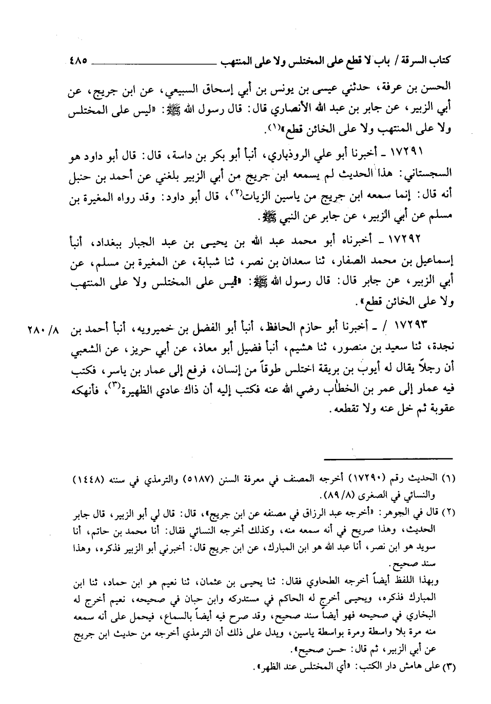17292 - أَخْبَرَنَاهُ أَبُو مُحَمَّدٍ عَبْدُ اللهِ بْنُ يَحْيَى بْنِ عَبْدِ الْجَبَّارِ، بِبَغْدَادَ , أنبأ إِسْمَاعِيلُ بْنُ مُحَمَّدٍ الصَّفَّارُ، ثنا سَعْدَانُ بْنُ نَصْرٍ، ثنا شَبَابَةُ، عَنِ الْمُغِيرَةِ بْنِ مُسْلِمٍ، عَنْ أَبِي الزُّبَيْرِ، عَنْ جَابِرٍ، قَالَ: قَالَ رَسُولُ اللهِ صَلَّى اللهُ عَلَيْهِ وَسَلَّمَ: §" لَيْسَ عَلَى الْمُخْتَلِسِ , وَلَا عَلَى الْمُنْتَهِبِ , وَلَا عَلَى الْخَائِنِ قَطْعٌ "