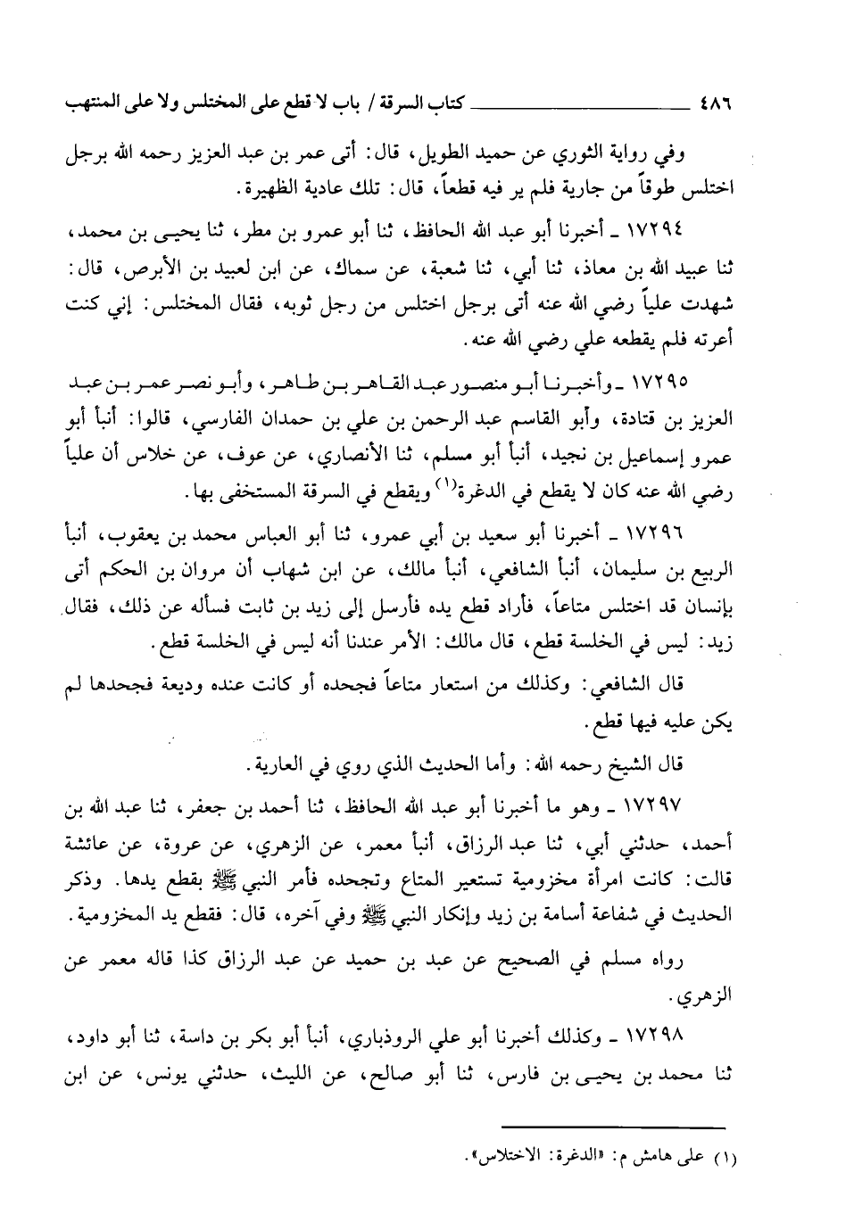 17295 - وَأَخْبَرَنَا أَبُو مَنْصُورٍ عَبْدُ الْقَاهِرِ بْنُ طَاهِرٍ، وَأَبُو نَصْرٍ عُمَرُ بْنُ عَبْدِ الْعَزِيزِ بْنِ قَتَادَةَ , وَأَبُو الْقَاسِمِ عَبْدُ الرَّحْمَنِ بْنُ عَلِيِّ بْنِ حَمْدَانَ الْفَارِسِيُّ، قَالُوا: أنبأ أَبُو عَمْرٍو إِسْمَاعِيلُ بْنُ نُجَيْدٍ , أنبأ أَبُو مُسْلِمٍ، ثنا الْأَنْصَارِيُّ، عَنْ عَوْفٍ، عَنْ خِلَاسٍ، أَنَّ عَلِيًّا، رَضِيَ اللهُ عَنْهُ §" كَانَ لَا يَقْطَعُ فِي الدَّغْرَةِ , وَيَقْطَعُ فِي السَّرِقَةِ الْمُسْتَخْفَى بِهَا "