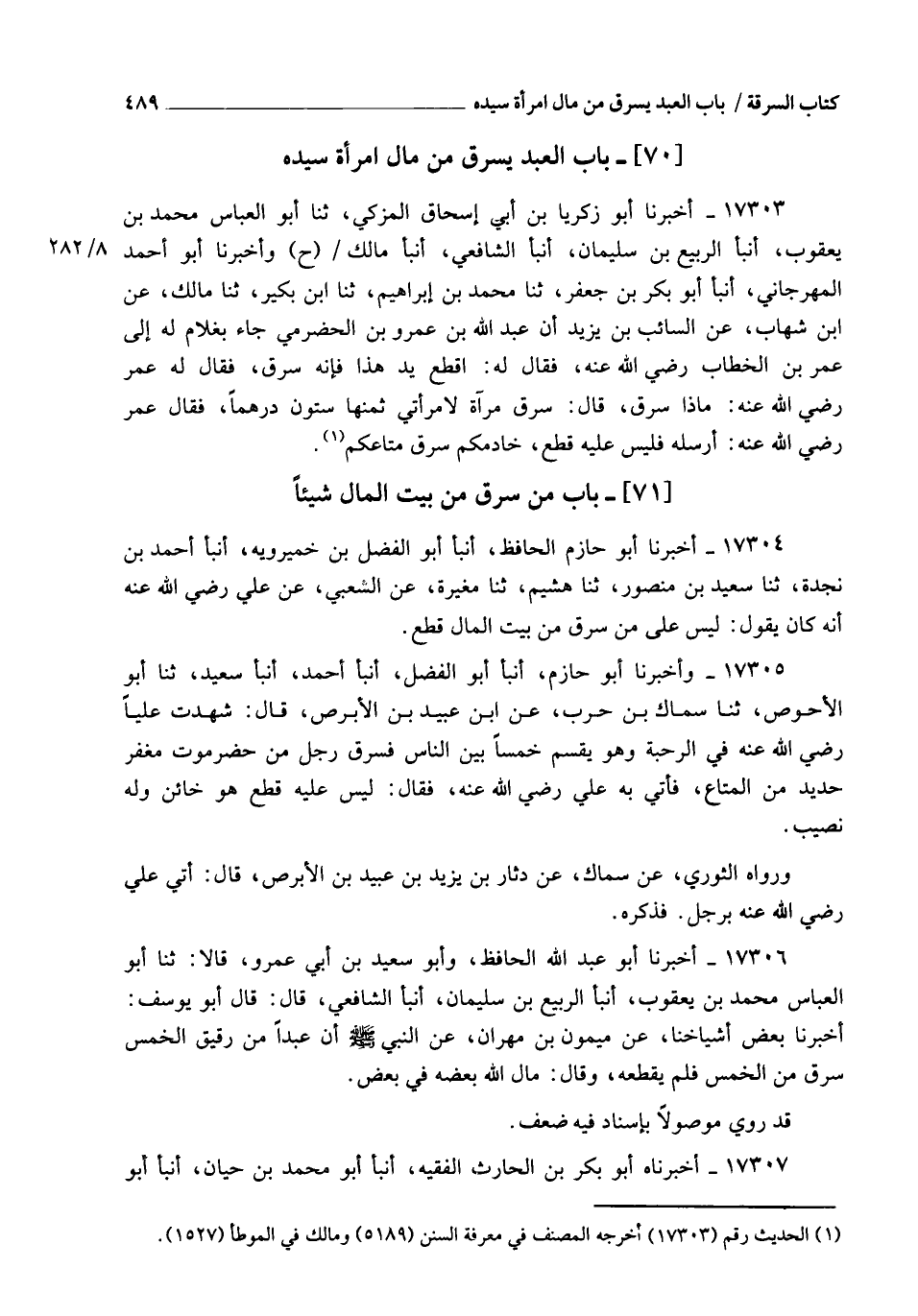 17304 - أَخْبَرَنَا أَبُو حَازِمٍ الْحَافِظُ، أنبأ أَبُو الْفَضْلِ بْنُ خَمِيرَوَيْهِ، أنبأ أَحْمَدُ بْنُ نَجْدَةَ، ثنا سَعِيدُ بْنُ مَنْصُورٍ، ثنا هُشَيْمٌ، ثنا مُغِيرَةُ، عَنِ الشَّعْبِيِّ، عَنْ عَلِيٍّ، رَضِيَ اللهُ عَنْهُ , أَنَّهُ كَانَ يَقُولُ: §" لَيْسَ عَلَى مَنْ سَرَقَ مِنْ بَيْتِ الْمَالِ قَطْعٌ "