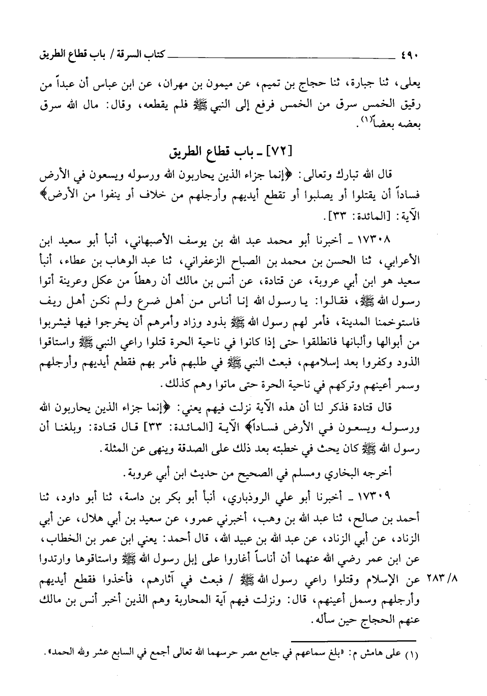 17309 - أَخْبَرَنَا أَبُو عَلِيٍّ الرُّوذْبَارِيُّ، أنبأ أَبُو بَكْرِ بْنُ دَاسَةَ، ثنا أَبُو دَاوُدَ، ثنا أَحْمَدُ بْنُ صَالِحٍ، ثنا عَبْدُ اللهِ بْنُ وَهْبٍ، أَخْبَرَنِي عَمْرٌو، عَنْ سَعِيدِ بْنِ أَبِي هِلَالٍ، عَنْ أَبِي الزِّنَادِ، عَنْ عَبْدِ اللهِ بْنِ عُبَيْدِ اللهِ، قَالَ أَحْمَدُ: يَعْنِي ابْنَ عُمَرَ بْنِ الْخَطَّابِ، عَنِ ابْنِ عُمَرَ رَضِيَ اللهُ عَنْهُمَا , أَنَّ أُنَاسًا، أَغَارُوا عَلَى إِبِلِ رَسُولِ اللهِ صَلَّى اللهُ عَلَيْهِ وَسَلَّمَ وَاسْتَاقُوهَا وَارْتَدُّوا عَنِ الْإِسْلَامِ وَقَتَلُوا رَاعِيَ رَسُولِ اللهِ صَلَّى اللهُ عَلَيْهِ وَسَلَّمَ , فَبَعَثَ فِي آثَارِهِمْ فَأُخِذُوا " §فَقَطَعَ أَيْدِيَهُمْ وَأَرْجُلَهُمْ وَسَمَلَ أَعْيُنَهُمْ " , قَالَ: وَنَزَلَتْ فِيهِمْ آيَةُ الْمُحَارَبَةِ , وَهُمُ الَّذِينَ أَخْبَرَ أَنَسُ بْنُ مَالِكٍ عَنْهُمُ الْحَجَّاجَ حِينَ سَأَلَهُ