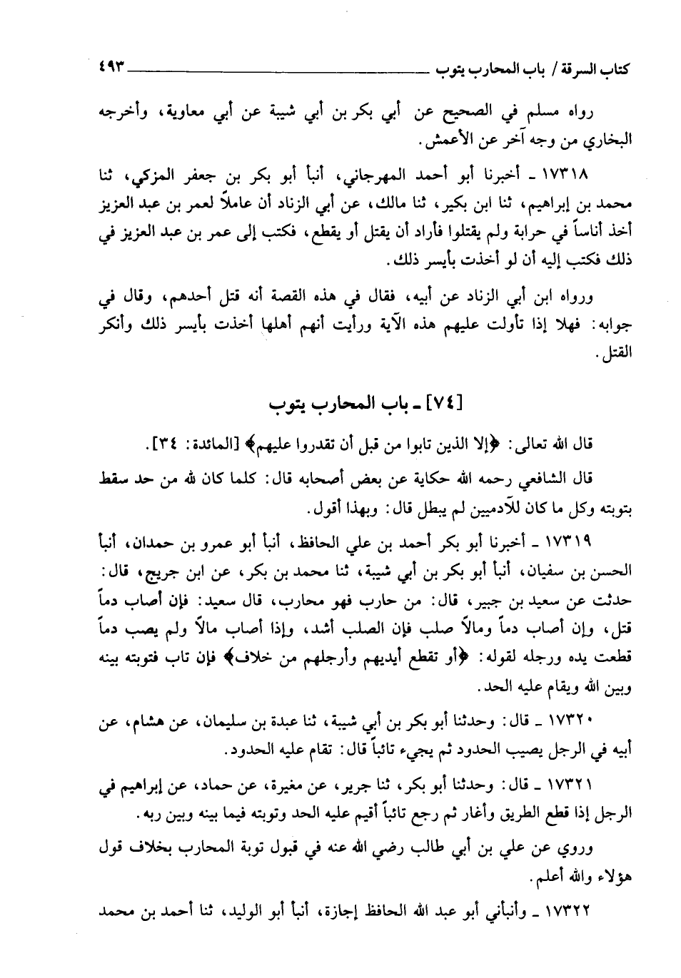17321 - قَالَ: وَحَدَّثَنَا أَبُو بَكْرٍ، ثنا جَرِيرٌ، عَنْ مُغِيرَةَ، عَنْ حَمَّادٍ، عَنْ إِبْرَاهِيمَ " §فِي الرَّجُلِ إِذَا قَطَعَ الطَّرِيقَ وَأَغَارَ ثُمَّ رَجَعَ تَائِبًا، أُقِيمَ عَلَيْهِ الْحَدُّ , وَتَوْبَتُهُ فِيمَا بَيْنَهُ وَبَيْنَ رَبِّهِ " وَرُوِيَ عَنْ عَلِيِّ بْنِ أَبِي طَالِبٍ رَضِيَ اللهُ عَنْهُ فِي قَبُولِ تَوْبَةِ الْمُحَارِبِ بِخِلَافِ قَوْلِ هَؤُلَاءِ , وَاللهُ أَعْلَمُ