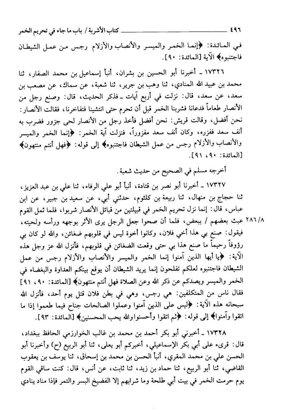 17328 - أَخْبَرَنِي أَبُو بَكْرٍ أَحْمَدُ بْنُ مُحَمَّدِ بْنِ غَالِبٍ الْخُوَارَزْمِيُّ الْحَافِظُ بِبَغْدَادَ قَالَ: قُرِئَ عَلَى أَبِي بَكْرٍ الْإِسْمَاعِيلِيِّ: أَخْبَرَكُمْ أَبُو يَعْلَى , ثنا أَبُو الرَّبِيعِ , ح وَأَخْبَرَنَا أَبُو الْحَسَنِ عَلِيُّ بْنُ مُحَمَّدٍ الْمُقْرِئُ , أنبأ الْحَسَنُ بْنُ مُحَمَّدِ بْنِ إِسْحَاقَ , ثنا يُوسُفُ بْنُ يَعْقُوبَ الْقَاضِي , ثنا أَبُو الرَّبِيعِ , ثنا حَمَّادُ بْنُ زَيْدٍ , ثنا ثَابِتٌ، عَنْ أَنَسٍ قَالَ: §" كُنْتُ سَاقِيَ الْقَوْمِ يَوْمَ حُرِّمَتِ الْخَمْرُ فِي بَيْتِ أَبِي طَلْحَةَ , وَمَا شَرَابُهُمْ إِلَّا الْفَضِيخُ الْبُسْرُ وَالتَّمْرُ , فَإِذَا مُنَادٍ يُنَادِي -[497]- قَالَ: اخْرُجْ فَانْظُرْ , فَخَرَجْتُ فَإِذَا مُنَادٍ يُنَادِي: أَلَا إِنَّ الْخَمْرَ قَدْ حُرِّمَتْ , قَالَ: فَجَرَتْ فِي سِكَكِ الْمَدِينَةِ , قَالَ: فَقَالَ لِي أَبُو طَلْحَةَ: اخْرُجْ فَاهْرِقْهَا , فَأَهْرَقْتُهَا , فَقَالُوا: أَوْ قَالَ بَعْضُهُمْ: قُتِلَ فُلَانٌ وَقُتِلَ فُلَانٌ , وَهِيَ فِي بُطُونِهِمْ , قَالَ: وَلَا أَدْرِي هُوَ فِي حَدِيثِ أَنَسٍ , فَأَنْزَلَ اللهُ عَزَّ وَجَلَّ: {لَيْسَ عَلَى الَّذِينَ آمَنُوا وَعَمِلُوا الصَّالِحَاتِ جُنَاحٌ فِيمَا طَعِمُوا إِذَا مَا اتَّقَوْا وَآمَنُوا وَعَمِلُوا الصَّالِحَاتِ} [المائدة: 93] " رَوَاهُ مُسْلِمٌ فِي الصَّحِيحِ عَنْ أَبِي الرَّبِيعِ , وَأَخْرَجَهُ الْبُخَارِيُّ مِنْ وَجْهٍ آخَرَ عَنْ حَمَّادٍ