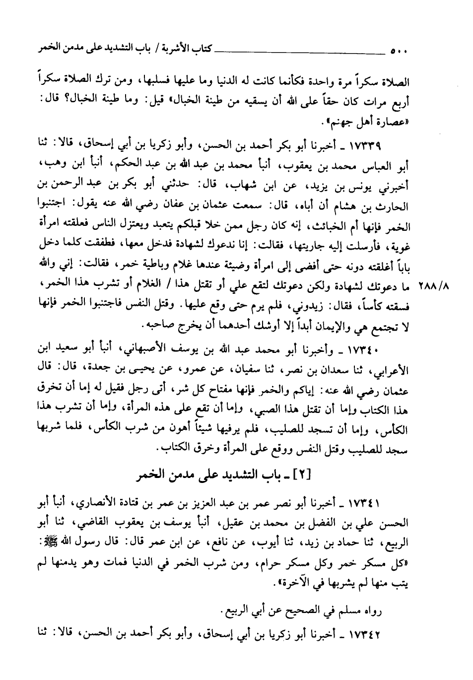 17341 - أَخْبَرَنَا أَبُو نَصْرٍ عُمَرُ بْنُ عَبْدِ الْعَزِيزِ بْنِ عُمَرَ بْنِ قَتَادَةَ الْأَنْصَارِيُّ , أنبأ أَبُو الْحَسَنِ عَلِيُّ بْنُ الْفَضْلِ بْنِ مُحَمَّدِ بْنِ عَقِيلٍ , أنبأ يُوسُفُ بْنُ يَعْقُوبَ الْقَاضِي، ثنا أَبُو الرَّبِيعِ، ثنا حَمَّادُ بْنُ زَيْدٍ، ثنا أَيُّوبُ، عَنْ نَافِعٍ، عَنِ ابْنِ عُمَرَ، قَالَ: قَالَ رَسُولُ اللهِ صَلَّى اللهُ عَلَيْهِ وَسَلَّمَ: §" كُلُّ مُسْكِرٍ خَمْرٌ , وَكُلُّ مُسْكِرٍ حَرَامٌ , وَمَنْ شَرِبَ الْخَمْرَ فِي الدُّنْيَا فَمَاتَ وَهُوَ يُدْمِنُهَا لَمْ يَتُبْ مِنْهَا لَمْ يَشْرَبْهَا فِي الْآخِرَةِ " رَوَاهُ مُسْلِمٌ فِي الصَّحِيحِ عَنْ أَبِي الرَّبِيعِ