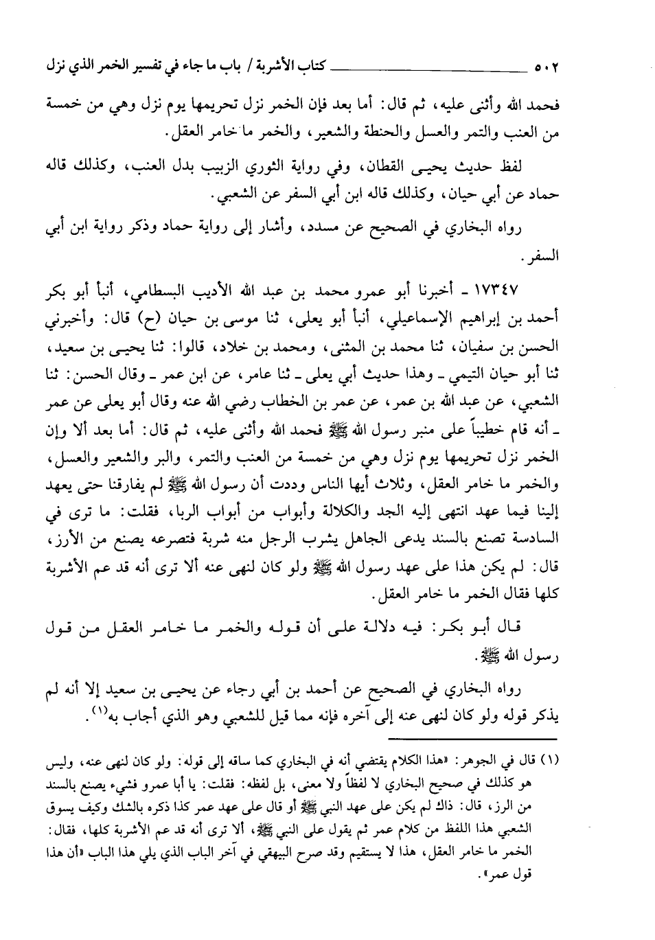 17347 - أَخْبَرَنَا أَبُو عَمْرٍو مُحَمَّدُ بْنُ عَبْدِ اللهِ الْأَدِيبُ الْبِسْطَامِيُّ , أنبأ أَبُو بَكْرٍ أَحْمَدُ بْنُ إِبْرَاهِيمَ الْإِسْمَاعِيلِيُّ , أنبأ أَبُو يَعْلَى، ثنا مُوسَى بْنُ حَيَّانَ، ح، قَالَ: وَأَخْبَرَنِي الْحَسَنُ بْنُ سُفْيَانَ، ثنا مُحَمَّدُ بْنُ الْمُثَنَّى، وَمُحَمَّدُ بْنُ خَلَّادٍ، قَالُوا: ثنا يَحْيَى بْنُ سَعِيدٍ، ثنا أَبُو حَيَّانَ التَّيْمِيُّ وَهَذَا حَدِيثُ أَبِي يَعْلَى , ثنا عَامِرٌ، عَنِ ابْنِ عُمَرَ وَقَالَ الْحَسَنُ: ثنا الشَّعْبِيُّ، عَنْ عَبْدِ اللهِ بْنِ عُمَرَ، عَنْ عُمَرَ بْنِ الْخَطَّابِ رَضِيَ اللهُ عَنْهُ وَقَالَ أَبُو يَعْلَى: عَنْ عُمَرَ أَنَّهُ قَامَ خَطِيبًا عَلَى مِنْبَرِ رَسُولِ اللهِ صَلَّى اللهُ عَلَيْهِ وَسَلَّمَ , فَحَمِدَ اللهَ وَأَثْنَى عَلَيْهِ ثُمَّ قَالَ: " أَمَّا بَعْدُ أَلَا وَإِنَّ §الْخَمْرَ نَزَلَ تَحْرِيمُهَا يَوْمَ نَزَلَ , وَهِيَ مِنْ خَمْسَةٍ: مِنَ الْعِنَبِ , وَالتَّمْرِ , وَالْبُرِّ , وَالشَّعِيرِ , وَالْعَسَلِ , وَالْخَمْرُ مَا خَامَرَ الْعَقْلَ , وَثَلَاثٌ أَيُّهَا النَّاسُ وَدِدْتُ أَنَّ رَسُولَ اللهِ صَلَّى اللهُ عَلَيْهِ وَسَلَّمَ لَمْ يُفَارِقْنَا حَتَّى يَعْهَدَ إِلَيْنَا فِيهَا عَهِدَ انْتُهِيَ إِلَيْهِ: الْجَدُّ وَالْكَلَالَةُ وَأَبْوَابٌ مِنْ أَبْوَابِ الرِّبَا، فَقُلْتُ: مَا تَرَى فِي السَّادِسَةِ تُصْنَعُ بِالسِّنْدِ يَدَّعِي الْجَاهِلُ يَشْرَبُ الرَّجُلُ مِنْهُ شَرْبَةً فَتَصْرَعُهُ , يُصْنَعُ مِنَ الْأَرْزِ؟ قَالَ: لَمْ يَكُنْ هَذَا عَلَى عَهْدِ رَسُولِ اللهِ صَلَّى اللهُ عَلَيْهِ وَسَلَّمَ , وَلَوْ كَانَ لَنَهَى عَنْهُ , أَلَا تَرَى أَنَّهُ قَدْ عَمَّ الْأَشْرِبَةَ كُلَّهَا فَقَالَ: الْخَمْرُ مَا خَامَرَ الْعَقْلَ " قَالَ أَبُو بَكْرٍ: فِيهِ دَلَالَةٌ عَلَى أَنَّ قَوْلَهُ: وَالْخَمْرُ مَا خَامَرَ الْعَقْلُ , مِنْ قَوْلِ رَسُولِ اللهِ صَلَّى اللهُ عَلَيْهِ وَسَلَّمَ رَوَاهُ الْبُخَارِيُّ فِي الصَّحِيحِ عَنْ أَحْمَدَ بْنِ أَبِي رَجَاءٍ، عَنْ يَحْيَى بْنِ سَعِيدٍ , إِلَّا أَنَّهُ لَمْ يَذْكُرْ قَوْلَهُ: وَلَوْ كَانَ لَنَهَى عَنْهُ , إِلَى آخِرِهِ , فَإِنَّهُ مِمَّا قِيلَ لِلشَّعْبِيِّ , وَهُوَ الَّذِي أَجَابَ بِهِ