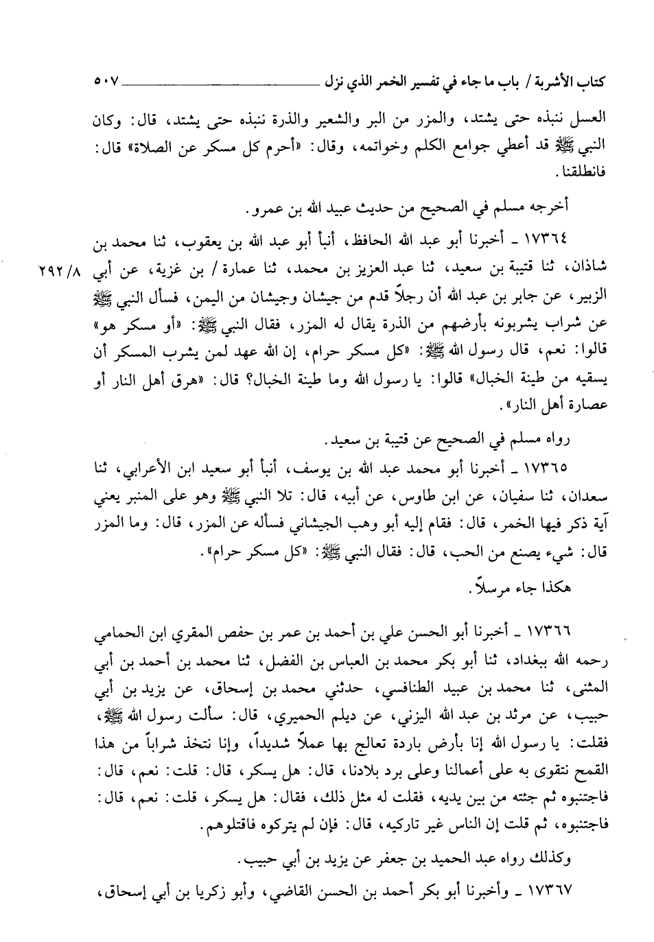 17365 - أَخْبَرَنَا أَبُو مُحَمَّدٍ عَبْدُ اللهِ بْنُ يُوسُفَ، أنبأ أَبُو سَعِيدِ بْنُ الْأَعْرَابِيِّ، ثنا سَعْدَانُ، ثنا سُفْيَانُ، عَنِ ابْنِ طَاوُسٍ، عَنْ أَبِيهِ، قَالَ: تَلَا النَّبِيُّ صَلَّى اللهُ عَلَيْهِ وَسَلَّمَ وَهُوَ عَلَى الْمِنْبَرِ , يَعْنِي آيَةً , ذَكَرَ فِيهَا الْخَمْرَ، قَالَ: فَقَامَ إِلَيْهِ أَبُو وَهْبٍ الْجَيْشَانِيُّ فَسَأَلَهُ عَنِ الْمِزْرِ، قَالَ: " وَمَا الْمِزْرُ؟ " قَالَ: شَيْءٌ يُصْنَعُ مِنَ الْحَبِّ، قَالَ: فَقَالَ النَّبِيُّ صَلَّى اللهُ عَلَيْهِ وَسَلَّمَ: §" كُلُّ مُسْكِرٍ حَرَامٌ " هَكَذَا جَاءَ مُرْسَلًا