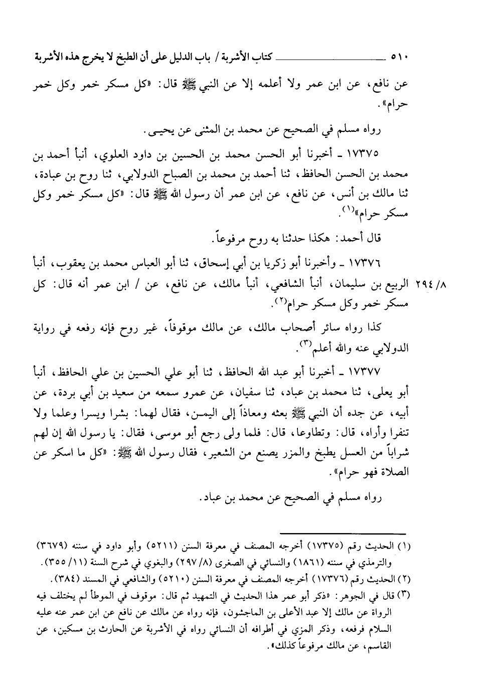 17376 - وَأَخْبَرَنَا أَبُو زَكَرِيَّا بْنُ أَبِي إِسْحَاقَ، ثنا أَبُو الْعَبَّاسِ مُحَمَّدُ بْنُ يَعْقُوبَ , أنبأ الرَّبِيعُ بْنُ سُلَيْمَانَ، أنبأ الشَّافِعِيُّ، أنبأ مَالِكٌ، عَنْ نَافِعٍ، عَنِ ابْنِ عُمَرَ، أَنَّهُ قَالَ: §" كُلُّ مُسْكِرٍ خَمْرٌ , وَكُلُّ مُسْكِرٍ حَرَامٌ " كَذَا رَوَاهُ سَائِرُ أَصْحَابِ مَالِكٍ عَنْ مَالِكٍ مَوْقُوفًا , غَيْرُ رَوْحٍ فَإِنَّهُ رَفَعَهُ فِي رِوَايَةِ الدَّوْلَابِيِّ عَنْهُ , وَاللهُ أَعْلَمُ
