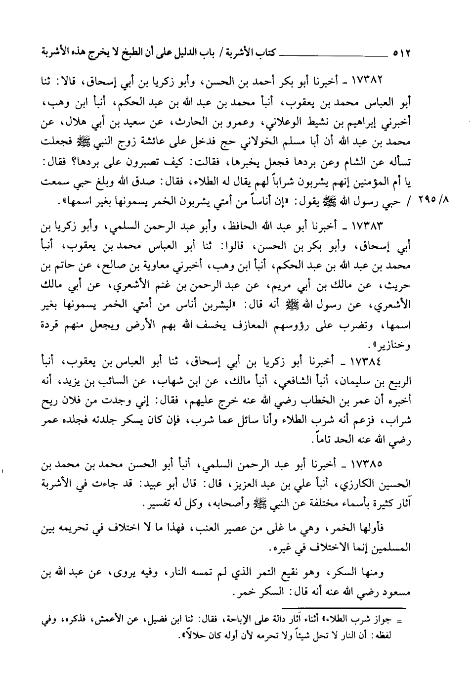 17382 - أَخْبَرَنَا أَبُو بَكْرٍ أَحْمَدُ بْنُ الْحَسَنِ، وَأَبُو زَكَرِيَّا بْنُ أَبِي إِسْحَاقَ , قَالَا: ثنا أَبُو الْعَبَّاسِ مُحَمَّدُ بْنُ يَعْقُوبَ , أنبأ مُحَمَّدُ بْنُ عَبْدِ اللهِ بْنِ عَبْدِ الْحَكَمِ، أنبأ ابْنُ وَهْبٍ، أَخْبَرَنِي إِبْرَاهِيمُ بْنُ نَشِيطٍ الْوَعْلَانِيُّ، وَعَمْرُو بْنُ الْحَارِثِ، عَنْ سَعِيدِ بْنِ أَبِي هِلَالٍ، عَنْ مُحَمَّدِ بْنِ عَبْدِ اللهِ، أَنَّ أَبَا مُسْلِمٍ الْخَوْلَانِيَّ، حَجَّ فَدَخَلَ عَلَى عَائِشَةَ زَوْجِ النَّبِيِّ صَلَّى اللهُ عَلَيْهِ وَسَلَّمَ , فَجَعَلَتْ تَسْأَلُهُ عَنِ الشَّامِ وَعَنْ بَرْدِهَا , فَجَعَلَ يُخْبِرُهَا , فَقَالَتْ: كَيْفَ تَصْبِرُونَ عَلَى بَرْدِهَا؟ فَقَالَ: يَا أُمَّ الْمُؤْمِنِينَ إِنَّهُمْ يَشْرَبُونَ شَرَابًا لَهُمْ يُقَالُ لَهُ الطِّلَاءُ، فَقَالَتْ: صَدَقَ اللهُ , وَبَلَّغَ حِبِّي , سَمِعْتُ حِبِّي رَسُولَ اللهِ صَلَّى اللهُ عَلَيْهِ وَسَلَّمَ يَقُولُ: §" إِنَّ أُنَاسًا مِنْ أُمَّتِي يَشْرَبُونَ الْخَمْرَ يُسَمُّونَهَا بِغَيْرِ اسْمِهَا "