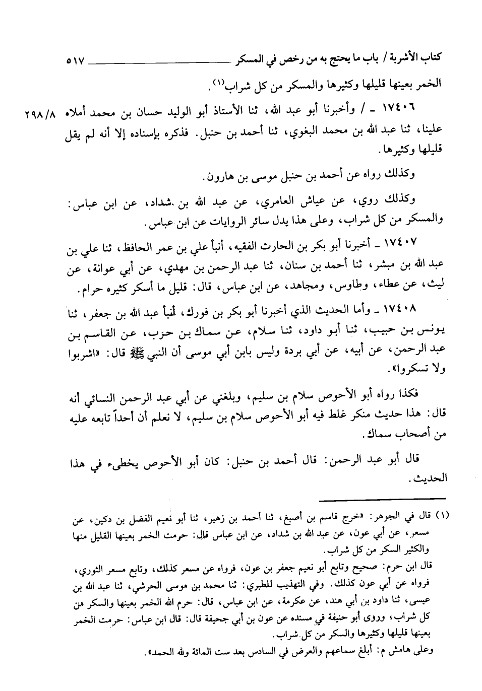 17406 - وَأَخْبَرَنَا أَبُو عَبْدِ اللهِ، ثنا الْأُسْتَاذُ أَبُو الْوَلِيدِ حَسَّانُ بْنُ مُحَمَّدٍ , أَمْلَاهُ عَلَيْنَا , ثنا عَبْدُ اللهِ بْنُ مُحَمَّدٍ الْبَغَوِيُّ، ثنا أَحْمَدُ بْنُ حَنْبَلٍ، فَذَكَرَهُ بِإِسْنَادِهِ , إِلَّا أَنَّهُ لَمْ يَقُلْ: قَلِيلُهَا وَكَثِيرُهَا وَكَذَلِكَ رَوَاهُ عَنْ أَحْمَدَ بْنِ حَنْبَلٍ عَنْ مُوسَى بْنُ هَارُونَ , وَكَذَلِكَ رُوِيَ عَنْ عَيَّاشٍ الْعَامِرِيِّ، عَنْ عَبْدِ اللهِ بْنِ شَدَّادٍ، عَنِ ابْنِ عَبَّاسٍ: " وَالْمُسْكِرُ مِنْ كُلِّ شَرَابٍ " , وَعَلَى هَذَا يَدُلُّ سَائِرُ الرِّوَايَاتِ عَنِ ابْنِ عَبَّاسٍ
