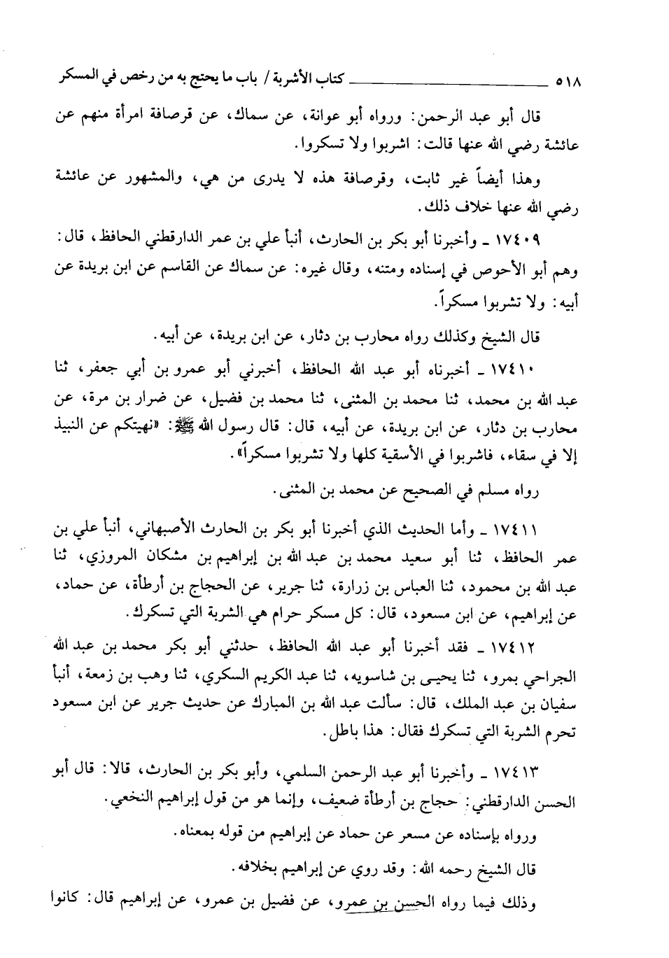 17413 - وَأَخْبَرَنَا أَبُو عَبْدِ الرَّحْمَنِ السُّلَمِيُّ، وَأَبُو بَكْرِ بْنُ الْحَارِثِ , قَالَا: قَالَ أَبُو الْحَسَنِ الدَّارَقُطْنِيُّ: حَجَّاجُ بْنُ أَرْطَاةَ ضَعِيفٌ , وَإِنَّمَا هُوَ مِنْ قَوْلِ إِبْرَاهِيمَ النَّخَعِيِّ. وَرَوَاهُ بِإِسْنَادِهِ عَنْ مِسْعَرٍ، عَنْ حَمَّادٍ، عَنْ إِبْرَاهِيمَ مِنْ قَوْلِهِ بِمَعْنَاهُ. قَالَ الشَّيْخُ رَحِمَهُ اللهُ: وَقَدْ رُوِيَ عَنْ إِبْرَاهِيمَ بِخِلَافِهِ , وَذَلِكَ فِيمَا رَوَاهُ الْحَسَنُ بْنُ عَمْرٍو، عَنْ فُضَيْلِ بْنِ عَمْرٍو، عَنْ إِبْرَاهِيمَ قَالَ: كَانُوا -[519]- يَرَوْنَ أَنَّ مَنْ شَرِبَ شَرَابًا فَسَكِرَ مِنْهُ لَمْ يَصْلُحْ لَهُ أَنْ يَعُودَ فِيهِ