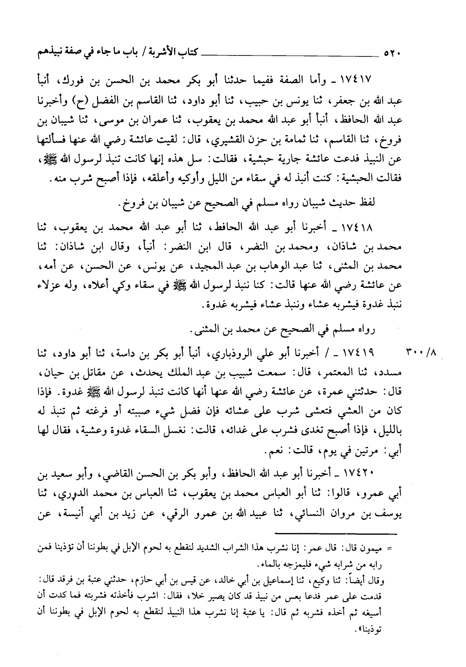 17418 - أَخْبَرَنَا أَبُو عَبْدِ اللهِ الْحَافِظُ، ثنا أَبُو عَبْدِ اللهِ مُحَمَّدُ بْنُ يَعْقُوبَ , ثنا مُحَمَّدُ بْنُ شَاذَانَ، وَمُحَمَّدُ بْنُ النَّضْرِ، قَالَ ابْنُ النَّضْرِ: أنبأ وَقَالَ ابْنُ شَاذَانَ: ثنا مُحَمَّدُ بْنُ الْمُثَنَّى، ثنا عَبْدُ الْوَهَّابِ بْنُ عَبْدِ الْمَجِيدِ، عَنْ يُونُسَ، عَنِ الْحَسَنِ، عَنْ أُمِّهِ، عَنْ عَائِشَةَ، رَضِيَ اللهُ عَنْهَا قَالَتْ: " كُنَّا نَنْبِذُ لِرَسُولِ اللهِ صَلَّى اللهُ عَلَيْهِ وَسَلَّمَ فِي سِقَاءٍ وُكِيَ أَعْلَاهُ , وَلَهُ عَزْلَاءُ , §نَنْبِذُ غُدْوَةً فَيَشْرَبُهُ عِشَاءً , وَنَنْبِذُ عِشَاءً فَيَشْرَبُهُ غُدْوَةً " رَوَاهُ مُسْلِمٌ فِي الصَّحِيحِ عَنْ مُحَمَّدِ بْنِ الْمُثَنَّى