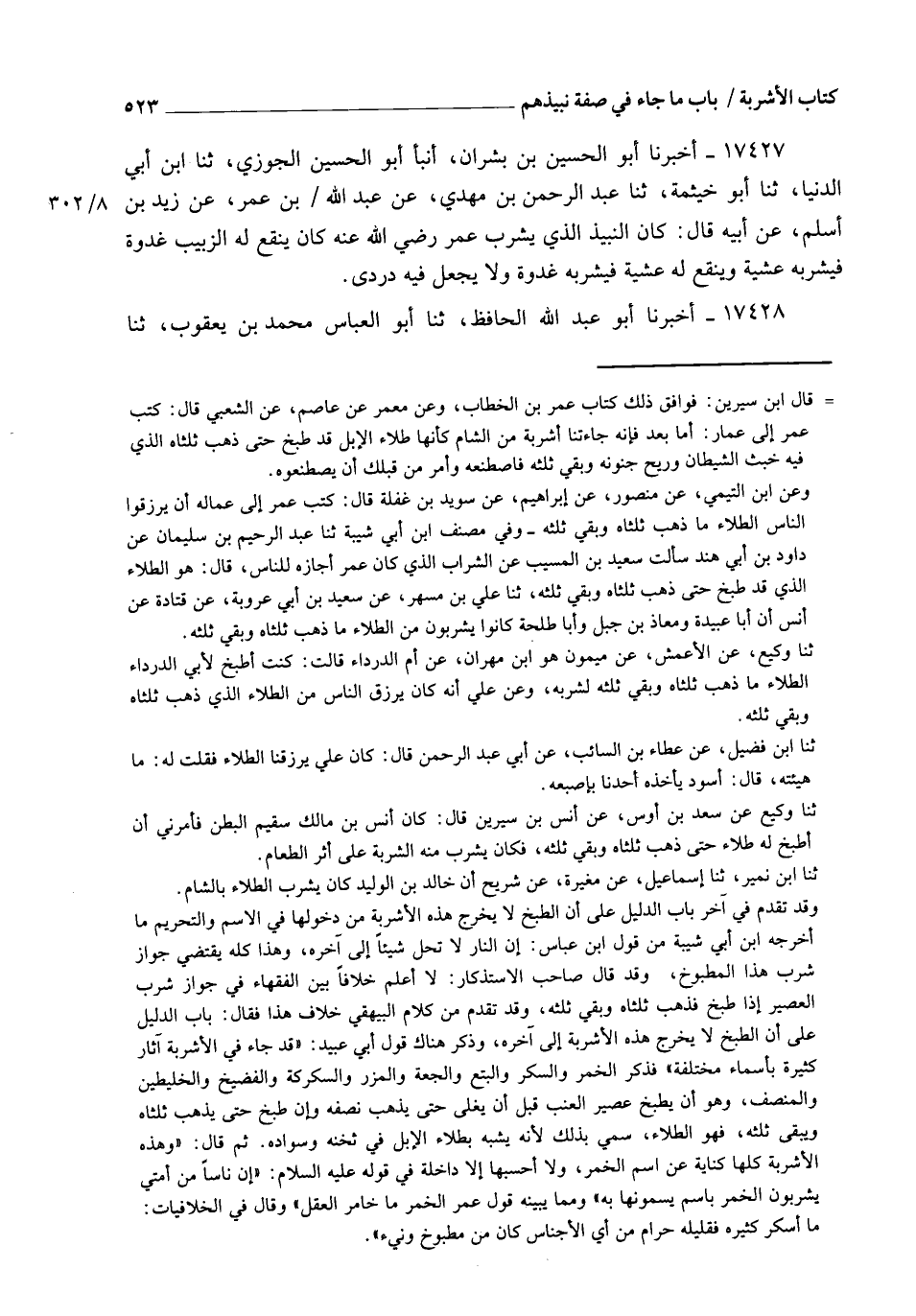 17427 - أَخْبَرَنَا أَبُو الْحُسَيْنِ بْنُ بِشْرَانَ، أنبأ أَبُو الْحُسَيْنِ الْجُوزِيُّ، ثنا ابْنُ أَبِي الدُّنْيَا، ثنا أَبُو خَيْثَمَةَ، ثنا عَبْدُ الرَّحْمَنِ بْنُ مَهْدِيٍّ، عَنْ عَبْدِ اللهِ بْنِ عُمَرَ، عَنْ زَيْدِ بْنِ أَسْلَمَ، عَنْ أَبِيهِ، قَالَ: §" كَانَ النَّبِيذُ الَّذِي يَشْرَبُ عُمَرُ رَضِيَ اللهُ عَنْهُ كَانَ يُنْقَعُ لَهُ الزَّبِيبُ غُدْوَةً فَيَشْرَبُهُ عَشِيَّةً , وَيُنْقَعُ لَهُ عَشِيَّةً فَيَشْرَبُهُ غُدْوَةً , وَلَا يُجْعَلُ فِيهِ دُرْدِيٌّ "