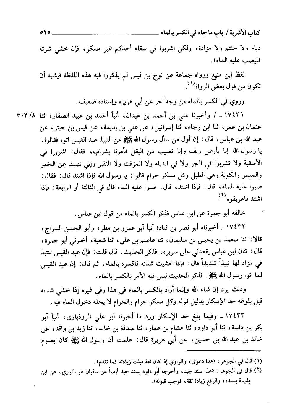17432 - أَخْبَرَنَاهُ أَبُو نَصْرِ بْنُ قَتَادَةَ، أنبأ أَبُو عَمْرِو بْنُ مَطَرٍ، وَأَبُو الْحَسَنِ السِّرَاجُ، قَالَا: ثنا مُحَمَّدُ بْنُ يَحْيَى بْنِ سُلَيْمَانَ، ثنا عَاصِمُ بْنُ عَلِيٍّ، ثنا شُعْبَةُ، أَخْبَرَنِي أَبُو جَمْرَةَ، قَالَ: كَانَ ابْنُ عَبَّاسٍ يُقْعِدُنِي عَلَى سَرِيرِهِ , فَذَكَرَ الْحَدِيثَ، قَالَ: قُلْتُ: فَإِنَّ عَبْدَ الْقَيْسِ تَنْتَبِذُ فِي مَزَادٍ لَهَا نَبِيذًا شَدِيدًا، قَالَ: فَإِذَا خَشِيتَ شِدَّتَهُ فَاكْسِرْهُ بِالْمَاءِ , ثُمَّ قَالَ: إِنَّ عَبْدَ الْقَيْسِ لَمَّا أَتَوْا رَسُولَ اللهِ صَلَّى اللهُ عَلَيْهِ وَسَلَّمَ , فَذَكَرَ الْحَدِيثَ , لَيْسَ فِيهِ الْأَمْرُ بِالْكَسْرِ بِالْمَاءِ وَذَلِكَ يَرِدُ إِنْ شَاءَ اللهُ , وَإِنَّمَا أَرَادَ بِالْكَسْرِ بِالْمَاءِ فِي هَذَا وَفِي غَيْرِهِ: إِذَا خَشِيَ شِدَّتَهُ قَبْلَ بُلُوغِهِ حَدَّ الْإِسْكَارِ بِدَلِيلِ قَوْلِهِ: وَكُلُّ مُسْكِرٍ حَرَامٌ , وَالْحَرَامُ لَا يُحِلُّهُ دُخُولُ الْمَاءِ فِيهِ