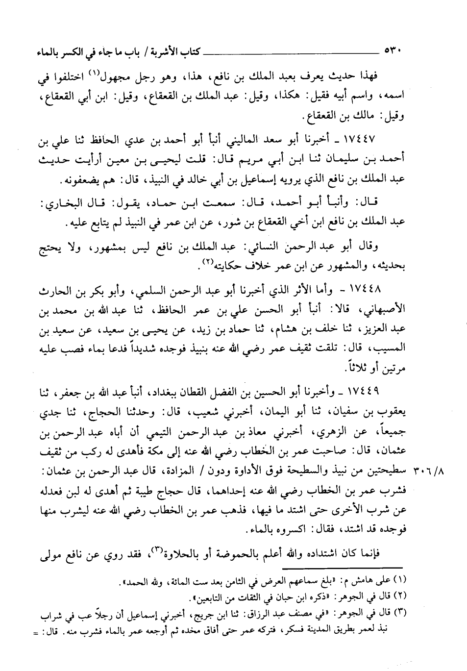17448 - وَأَمَّا الْأَثَرُ الَّذِي أَخْبَرَنَا أَبُو عَبْدِ الرَّحْمَنِ السُّلَمِيُّ، وَأَبُو بَكْرِ بْنُ الْحَارِثِ الْأَصْبَهَانِيُّ , قَالَا: أنبأ أَبُو الْحَسَنِ عَلِيُّ بْنُ عُمَرَ الْحَافِظُ , ثنا عَبْدُ اللهِ بْنُ مُحَمَّدِ بْنِ عَبْدِ الْعَزِيزِ، ثنا خَلَفُ بْنُ هِشَامٍ، ثنا حَمَّادُ بْنُ زَيْدٍ، عَنْ يَحْيَى بْنِ سَعِيدٍ، عَنْ سَعِيدِ بْنِ الْمُسَيِّبِ، قَالَ: تَلَقَّتْ ثَقِيفٌ عُمَرَ رَضِيَ اللهُ عَنْهُ بِنَبِيذٍ , §" فَوَجَدَهُ شَدِيدًا فَدَعَا بِمَاءٍ فَصَبَّ عَلَيْهِ مَرَّتَيْنِ أَوْ ثَلَاثًا "
