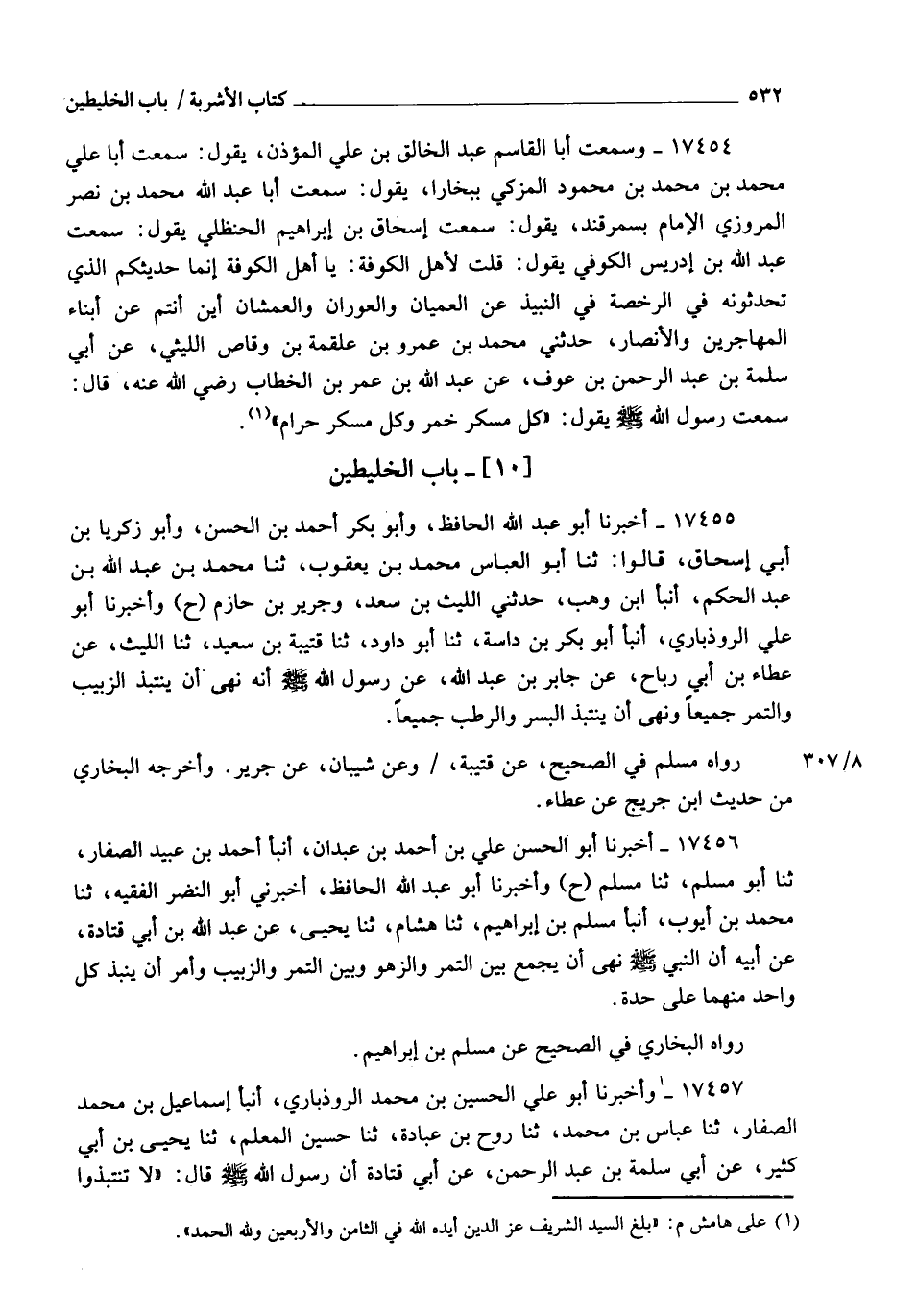 17454 - وَسَمِعْتُ أَبَا الْقَاسِمِ عَبْدَ الْخَالِقِ بْنَ عَلِيٍّ الْمُؤَذِّنَ، يَقُولُ: سَمِعْتُ أَبَا عَلِيٍّ مُحَمَّدَ بْنَ مُحَمَّدِ بْنِ مَحْمُودٍ الْمُزَكِّي بِبُخَارَا يَقُولُ: سَمِعْتُ أَبَا عَبْدِ اللهِ مُحَمَّدَ بْنَ نَصْرٍ الْمَرْوَزِيُّ الْإِمَامُ بِسَمَرْقَنْدَ يَقُولُ: سَمِعْتُ إِسْحَاقَ بْنَ إِبْرَاهِيمَ الْحَنْظَلِيَّ، يَقُولُ: سَمِعْتُ عَبْدَ اللهِ بْنَ إِدْرِيسَ الْكُوفِيَّ، يَقُولُ: قُلْتُ لِأَهْلِ الْكُوفَةِ: يَا أَهْلَ الْكُوفَةِ إِنَّمَا حَدِيثُكُمُ الَّذِي تُحَدِّثُونَهُ فِي الرُّخْصَةِ فِي النَّبِيذِ عَنِ الْعِمْيَانِ وَالْعُورَانِ وَالْعِمْشَانِ , أَيْنَ أَنْتُمْ عَنْ أَبْنَاءِ الْمُهَاجِرِينَ وَالْأَنْصَارِ؟ حَدَّثَنِي مُحَمَّدُ بْنُ عَمْرِو بْنِ عَلْقَمَةَ بْنِ وَقَّاصٍ اللَّيْثِيُّ، عَنْ أَبِي سَلَمَةَ بْنِ عَبْدِ الرَّحْمَنِ بْنِ عَوْفٍ، عَنْ عَبْدِ اللهِ بْنِ عُمَرَ بْنِ الْخَطَّابِ رَضِيَ اللهُ عَنْهُ قَالَ: سَمِعْتُ رَسُولَ اللهِ صَلَّى اللهُ عَلَيْهِ وَسَلَّمَ يَقُولُ: §" كُلُّ مُسْكِرٍ خَمْرٌ , وَكُلُّ مُسْكِرٍ حَرَامٌ "