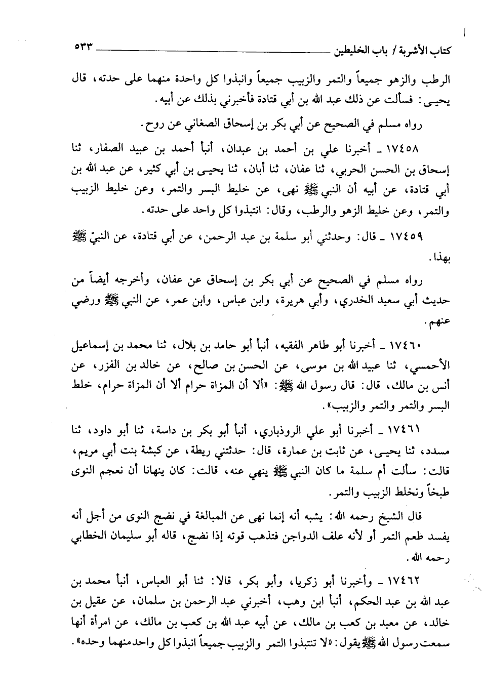 17462 - وَأَخْبَرَنَا أَبُو زَكَرِيَّا وَأَبُو بَكْرٍ , قَالَا: ثنا أَبُو الْعَبَّاسِ، أنبأ مُحَمَّدُ بْنُ عَبْدِ اللهِ بْنِ عَبْدِ الْحَكَمِ، أنبأ ابْنُ وَهْبٍ، أَخْبَرَنِي عَبْدُ الرَّحْمَنِ بْنُ سَلْمَانَ، عَنْ عَقِيلِ بْنِ خَالِدٍ، عَنْ مَعْبَدِ بْنِ كَعْبِ بْنِ مَالِكٍ، عَنْ أَخِيهِِ عَبْدِ اللهِ بْنِ كَعْبِ بْنِ مَالِكٍ، عَنِ امْرَأَةٍ، أَنَّهَا سَمِعَتْ رَسُولَ اللهِ صَلَّى اللهُ عَلَيْهِ وَسَلَّمَ يَقُولُ: §" لَا تَنْتَبِذُوا التَّمْرَ وَالزَّبِيبَ جَمِيعًا , انْبِذُوا كُلَّ وَاحِدٍ مِنْهُمَا وَحْدَهُ " -[534]- قَالَ الشَّيْخُ رَحِمَهُ اللهُ: نَهْيُ النَّبِيِّ صَلَّى اللهُ عَلَيْهِ وَسَلَّمَ عَنِ الْخَلِيطَيْنِ يَحْتَمِلُ أَمْرَيْنِ: أَحَدُهُمَا أَنْ يَكُونَ إِنَّمَا نَهَى عَنْهُ لِخَلْطِهِمَا سَوَاءً بَلَغَ حَدَّ الْإِسْكَارِ أَوْ لَمْ يَبْلُغْ , وَأَبَاحَ شُرْبَهُ إِذَا نُبِذَ عَلَى حِدَتِهِ , وَالْآخَرُ أَنْ يَكُونَ إِنَّمَا نَهَى عَنْهُ؛ لِأَنَّهُ أَقْرَبُ إِلَى الِاشْتِدَادِ , وَإِذَا نُبِذَ عَلَى حِدَتِهِ كَانَ أَبْعَدَ عَنِ الِاشْتِدَادِ , فَمَا لَمْ يَبْلُغْ حَالَةَ الِاشْتِدَادِ فِي الْمَوْضِعَيْنِ جَمِيعًا لَا يَحْرُمُ وَعَلَى هَذَا الْمَعْنَى الثَّانِي يَدُلُّ مَا