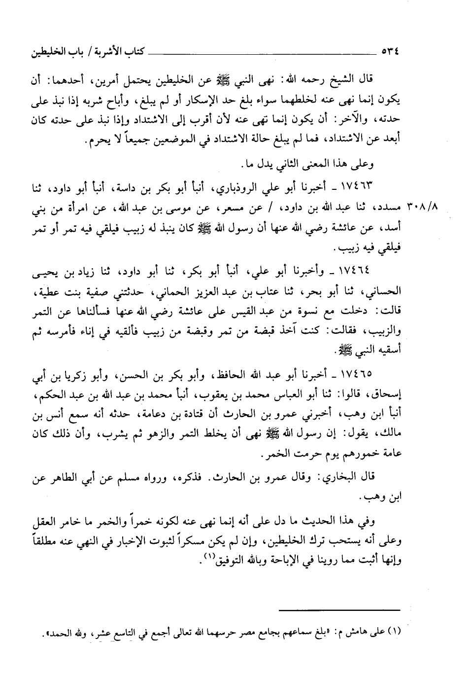 17465 - أَخْبَرَنَا أَبُو عَبْدِ اللهِ الْحَافِظُ، وَأَبُو بَكْرِ بْنُ الْحَسَنِ , وَأَبُو زَكَرِيَّا بْنُ أَبِي إِسْحَاقَ، قَالُوا: ثنا أَبُو الْعَبَّاسِ مُحَمَّدُ بْنُ يَعْقُوبَ , أنبأ مُحَمَّدُ بْنُ عَبْدِ اللهِ بْنِ عَبْدِ الْحَكَمِ، أنبأ ابْنُ وَهْبٍ، أَخْبَرَنِي عَمْرُو بْنُ الْحَارِثِ، أَنَّ قَتَادَةَ بْنَ دِعَامَةَ، حَدَّثَهُ , أَنَّهُ سَمِعَ أَنَسَ بْنَ مَالِكٍ، يَقُولُ: إِنَّ رَسُولَ اللهِ صَلَّى اللهُ عَلَيْهِ وَسَلَّمَ §" نَهَى أَنْ يُخْلَطَ التَّمْرُ وَالزَّهْوُ , ثُمَّ يُشْرَبُ , وَإِنَّ ذَلِكَ كَانَ عَامَّةَ خُمُورِهِمْ يَوْمَ حُرِّمَتِ الْخَمْرُ " قَالَ الْبُخَارِيُّ: وَقَالَ عَمْرُو بْنُ الْحَارِثِ: فَذَكَرَهُ وَرَوَاهُ مُسْلِمٌ عَنْ أَبِي الطَّاهِرِ عَنِ ابْنِ وَهْبٍ وَفِي هَذَا الْحَدِيثِ مَا دَلَّ عَلَى أَنَّهُ إِنَّمَا نَهَى عَنْهُ لِكَوْنِهِ خَمْرًا , وَالْخَمْرُ مَا خَامَرَ الْعَقْلَ , وَعَلَى أَنَّهُ يُسْتَحَبُّ تَرْكُ الْخَلِيطَيْنِ وَإِنْ لَمْ يَكُنْ مُسْكِرًا لِثُبُوتِ الْإِخْبَارِ فِي النَّهْيِ عَنْهُ مُطْلَقًا , وَإِنَّهَا أَثْبَتُ مِمَّا رُوِّينَا فِي الْإِبَاحَةِ , وَبِاللهِ التَّوْفِيقُ