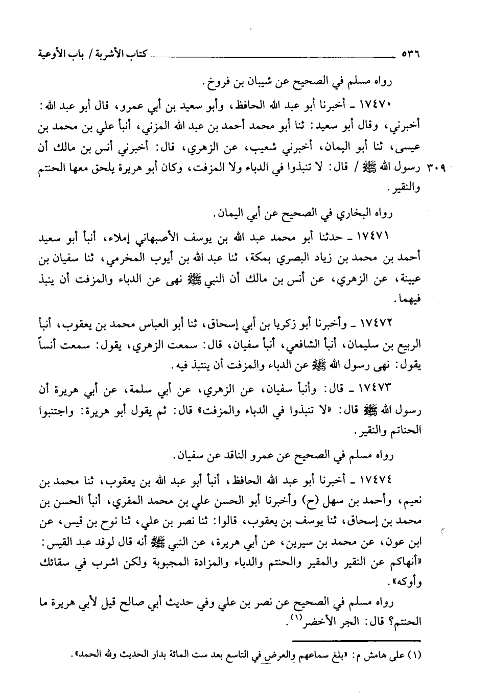 17474 - أَخْبَرَنَا أَبُو عَبْدِ اللهِ الْحَافِظُ، أنبأ أَبُو عَبْدِ اللهِ بْنُ يَعْقُوبَ، ثنا مُحَمَّدُ بْنُ نُعَيْمٍ، وَأَحْمَدُ بْنُ سَهْلٍ، ح وَأَخْبَرَنَا أَبُو الْحَسَنِ عَلِيُّ بْنُ مُحَمَّدٍ الْمُقْرِئُ , أنبأ الْحَسَنُ بْنُ مُحَمَّدِ بْنِ إِسْحَاقَ، ثنا يُوسُفُ بْنُ يَعْقُوبَ، قَالُوا: ثنا نَصْرُ بْنُ عَلِيٍّ، ثنا نُوحُ بْنُ قَيْسٍ، عَنِ ابْنِ عَوْنٍ، عَنْ مُحَمَّدِ بْنِ سِيرِينَ، عَنْ أَبِي هُرَيْرَةَ، عَنِ النَّبِيِّ صَلَّى اللهُ عَلَيْهِ وَسَلَّمَ أَنَّهُ قَالَ لِوَفْدِ عَبْدِ الْقَيْسِ: §" أَنْهَاكُمْ عَنِ النَّقِيرِ وَالْمُقَيَّرِ وَالْحَنْتَمِ وَالدُّبَّاءِ وَالْمَزَادَةِ الْمَجْبُوبَةِ , وَلَكِنِ اشْرَبْ فِي سِقَائِكَ وَأَوْكِهِ " رَوَاهُ مُسْلِمٌ فِي الصَّحِيحِ عَنْ نَصْرِ بْنِ عَلِيٍّ، وَفِي حَدِيثِ أَبِي صَالِحٍ: قِيلَ لِأَبِي هُرَيْرَةَ: مَا الْحَنْتَمُ؟ قَالَ: الْجَرُّ الْأَخْضَرُ