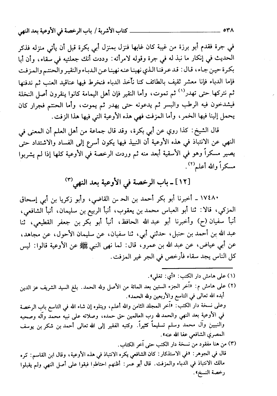 17480 - أَخْبَرَنَا أَبُو بَكْرٍ أَحْمَدُ بْنُ الْحَسَنِ الْقَاضِي وَأَبُو زَكَرِيَّا بْنُ أَبِي إِسْحَاقَ الْمُزَكِّي , قَالَا: ثنا أَبُو الْعَبَّاسِ مُحَمَّدُ بْنُ يَعْقُوبَ , أنبأ الرَّبِيعُ بْنُ سُلَيْمَانَ، أنبأ الشَّافِعِيُّ، أنبأ سُفْيَانُ، ح وَأَخْبَرَنَا أَبُو عَبْدِ اللهِ الْحَافِظُ، أنبأ أَبُو بَكْرِ بْنُ جَعْفَرٍ الْقَطِيعِيُّ، ثنا عَبْدُ اللهِ بْنُ أَحْمَدَ بْنِ حَنْبَلٍ، حَدَّثَنِي أَبِي، ثنا سُفْيَانُ، عَنْ سُلَيْمَانَ الْأَحْوَلِ، عَنْ مُجَاهِدٍ، عَنْ أَبِي عِيَاضٍ، عَنْ عَبْدِ اللهِ بْنِ عَمْرٍو، قَالَ: لَمَّا نَهَى النَّبِيُّ صَلَّى اللهُ عَلَيْهِ وَسَلَّمَ عَنِ الْأَوْعِيَةِ قَالُوا: لَيْسَ كُلُّ النَّاسِ يَجِدُ سِقَاءً , §فَأَرْخَصَ فِي الْجَرِّ غَيْرِ الْمُزَفَّتِ -[539]- لَفْظُ حَدِيثِ أَحْمَدَ , وَفِي رِوَايَةِ الشَّافِعِيِّ: فَأَذِنَ لَهُمْ فِي الْجَرِّ غَيْرِ الْمُزَفَّتِ , وَسَقَطَ مِنْ إِسْنَادِ حَدِيثِهِ أَبُو عِيَاضٍ , وَهُوَ فِيهِ أَخْرَجَهُ الْبُخَارِيُّ وَمُسْلِمٌ فِي الصَّحِيحِ عَنْ جَمَاعَةٍ عَنْ سُفْيَانَ