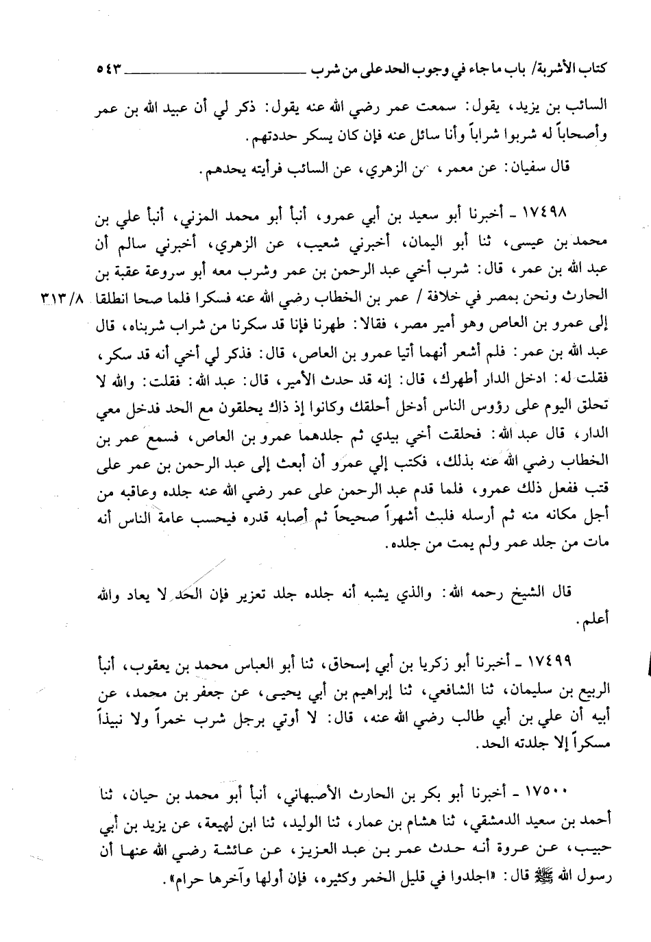 17498 - أَخْبَرَنَا أَبُو سَعِيدِ بْنُ أَبِي عَمْرٍو، أنبأ أَبُو مُحَمَّدٍ الْمُزَنِيُّ، أنبأ عَلِيُّ بْنُ مُحَمَّدِ بْنِ عِيسَى، ثنا أَبُو الْيَمَانِ، أَخْبَرَنِي شُعَيْبٌ، عَنِ الزُّهْرِيِّ، أَخْبَرَنِي سَالِمٌ، أَنَّ عَبْدَ اللهِ بْنَ عُمَرَ، قَالَ: §شَرِبَ أَخِي عَبْدُ الرَّحْمَنِ بْنُ عُمَرَ , وَشَرِبَ مَعَهُ أَبُو سِرْوَعَةَ عُقْبَةُ بْنُ الْحَارِثِ , وَنَحْنُ بِمِصْرَ فِي خِلَافَةِ عُمَرَ بْنِ الْخَطَّابِ رَضِيَ اللهُ عَنْهُ , فَسَكِرَا , فَلَمَّا صَحَا انْطَلَقَا إِلَى عَمْرِو بْنِ الْعَاصِ , وَهُوَ أَمِيرُ مِصْرَ , فَقَالَا: طَهِّرْنَا , فَإِنَّا قَدْ سَكِرْنَا مِنْ شَرَابٍ شَرِبْنَاهُ، قَالَ عَبْدُ اللهِ بْنُ عُمَرَ: فَلَمْ أَشْعُرْ أَنَّهُمَا أَتَيَا عَمْرَو بْنَ الْعَاصِ، قَالَ: فَذَكَرَ لِي أَخِي أَنَّهُ قَدْ سَكِرَ , فَقُلْتُ لَهُ: ادْخُلِ الدَّارَ أُطَهِّرْكَ، قَالَ: إِنَّهُ قَدْ حَدَّثَ الْأَمِيرَ، قَالَ عَبْدُ اللهِ: فَقُلْتُ: وَاللهِ لَا تُحْلَقُ الْيَوْمَ عَلَى رُءُوسِ النَّاسِ , ادْخُلْ أَحْلِقْكَ , وَكَانُوا إِذْ ذَاكَ يَحْلِقُونَ مَعَ الْحَدِّ , فَدَخَلَ مَعِيَ الدَّارَ، قَالَ عَبْدُ اللهِ: فَحَلَقْتُ أَخِي بِيَدِي , ثُمَّ جَلَدَهُمَا عَمْرُو بْنُ الْعَاصِ , فَسَمِعَ عُمَرُ بْنُ الْخَطَّابِ رَضِيَ اللهُ عَنْهُ بِذَلِكَ , فَكَتَبَ إِلَى عَمْرٍو أَنِ ابْعَثْ إِلِيَّ عَبْدَ الرَّحْمَنِ بْنَ عُمَرَ عَلَى قَتَبٍ , فَفَعَلَ ذَلِكَ عَمْرٌو , فَلَمَّا قَدِمَ عَبْدُ الرَّحْمَنِ عَلَى عُمَرَ رَضِيَ اللهُ عَنْهُ جَلَدَهُ وَعَاقَبَهُ مِنْ أَجْلِ مَكَانِهِ مِنْهُ , ثُمَّ أَرْسَلَهُ فَلَبِثَ أَشْهُرًا صَحِيحًا , ثُمَّ أَصَابَهُ قَدَرُهُ , فَيَحْسَبُ عَامَّةُ النَّاسِ أَنَّهُ مَاتَ مِنْ جَلْدِ عُمَرَ , وَلَمْ يَمُتْ مِنْ جِلْدِهِ قَالَ الشَّيْخُ رَحِمَهُ اللهُ: وَالَّذِي يُشْبِهُ أَنَّهُ جَلَدَهُ جَلْدَ تَعْزِيرٍ , فَإِنَّ الْحَدَّ لَا يُعَادُ , وَاللهُ أَعْلَمُ