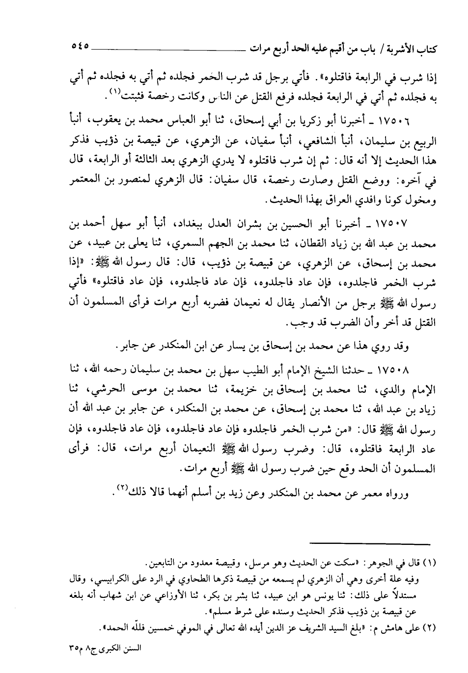 17508 - حَدَّثَنَا الشَّيْخُ الْإِمَامُ أَبُو الطِّيبِ سَهْلُ بْنُ مُحَمَّدِ بْنِ سُلَيْمَانَ رَحِمَهُ اللهُ , ثنا الْإِمَامُ وَالِدِي، ثنا مُحَمَّدُ بْنُ إِسْحَاقَ بْنِ خُزَيْمَةَ، ثنا مُحَمَّدُ بْنُ مُوسَى الْحَرَشِيُّ، ثنا زِيَادُ بْنُ عَبْدِ اللهِ، ثنا مُحَمَّدُ بْنُ إِسْحَاقَ، عَنْ مُحَمَّدِ بْنِ الْمُنْكَدِرِ، عَنْ جَابِرِ بْنِ عَبْدِ اللهِ، أَنَّ رَسُولَ اللهِ صَلَّى اللهُ عَلَيْهِ وَسَلَّمَ قَالَ: §" مَنْ شَرِبَ الْخَمْرَ فَاجْلِدُوهُ , فَإِنْ عَادَ فَاجْلِدُوهُ , فَإِنْ عَادَ فَاجْلِدُوهُ , فَإِنْ عَادَ الرَّابِعَةَ فَاقْتُلُوهُ " قَالَ: وَضَرَبَ رَسُولُ اللهِ صَلَّى اللهُ عَلَيْهِ وَسَلَّمَ النُّعَيْمَانَ أَرْبَعَ مَرَّاتٍ، قَالَ: فَرَأَى الْمُسْلِمُونَ أَنَّ الْحَدَّ قَدْ وَقَعَ حِينَ ضَرَبَ رَسُولُ اللهِ صَلَّى اللهُ عَلَيْهِ وَسَلَّمَ أَرْبَعَ مَرَّاتٍ وَرَوَاهُ مَعْمَرٌ عَنْ مُحَمَّدِ بْنِ الْمُنْكَدِرِ وَعَنْ زَيْدِ بْنِ أَسْلَمَ , أَنَّهُمَا قَالَا ذَلِكَ