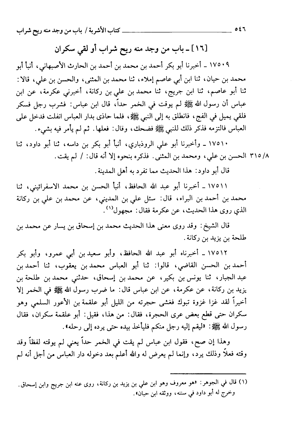 17512 - أَخْبَرَنَاهُ أَبُو عَبْدِ اللهِ الْحَافِظُ، وَأَبُو سَعِيدِ بْنُ أَبِي عَمْرٍو , وَأَبُو بَكْرٍ أَحْمَدُ بْنُ الْحَسَنِ الْقَاضِي، قَالُوا: ثنا أَبُو الْعَبَّاسِ مُحَمَّدُ بْنُ يَعْقُوبَ , ثنا أَحْمَدُ بْنُ عَبْدِ الْجَبَّارِ، ثنا يُونُسُ بْنُ بُكَيْرٍ، عَنْ مُحَمَّدِ بْنِ إِسْحَاقَ، حَدَّثَنِي مُحَمَّدُ بْنُ طَلْحَةَ بْنِ يَزِيدَ بْنِ رُكَانَةَ، عَنْ عِكْرِمَةَ، عَنِ ابْنِ عَبَّاسٍ، قَالَ: مَا ضَرَبَ رَسُولُ اللهِ صَلَّى اللهُ عَلَيْهِ وَسَلَّمَ فِي الْخَمْرِ إِلَّا أَخِيرًا، لَقَدْ غَزَا غَزْوَةَ تَبُوكَ فَغَشِيَ حُجْرَتَهُ مِنَ اللَّيْلِ أَبُو عَلْقَمَةَ بْنُ الْأَعْوَرِ السُّلَمِيُّ , وَهُوَ سَكْرَانُ , حَتَّى قَطَعَ بَعْضَ عُرَى الْحُجْرَةِ، فَقَالَ: " مَنْ هَذَا؟ " فَقِيلَ: أَبُو عَلْقَمَةَ سَكْرَانُ، فَقَالَ رَسُولُ اللهِ صَلَّى اللهُ عَلَيْهِ وَسَلَّمَ: §" لِيَقُمْ إِلَيْهِ رَجُلٌ مِنْكُمْ , فَلْيَأْخُذْ بِيَدِهِ حَتَّى يَرُدَّهُ إِلَى رَحْلِهِ " وَهَذَا إِنْ صَحَّ فَقَوْلُ ابْنِ عَبَّاسٍ: لَمْ يَقِتْ فِي الْخَمْرِ حَدًّا يَعْنِي: لَمْ يُوَقِّتْهُ لَفْظًا وَقَدْ وَقَّتَهُ فِعْلًا وَذَلِكَ يُرَدُّ , وَإِنَّمَا لَمْ يَعْرِضْ لَهُ , وَاللهُ أَعْلَمُ , بَعْدَ دُخُولِهِ دَارَ الْعَبَّاسِ مِنْ أَجْلِ أَنَّهُ لَمْ -[547]- يَكُنْ ثَبَتَ عَلَيْهِ الْحَدُّ بِإِقْرَارٍ مِنْهُ أَوْ بِشَهَادَةِ عُدُولٍ , وَإِنَّمَا لُقِيَ فِي الطَّرِيقِ يَمِيلُ فَظُنَّ بِهِ السُّكْرُ , فَلَمْ يَكْشِفْ عَنْهُ وَتَرَكَهُ , وَاللهُ أَعْلَمُ