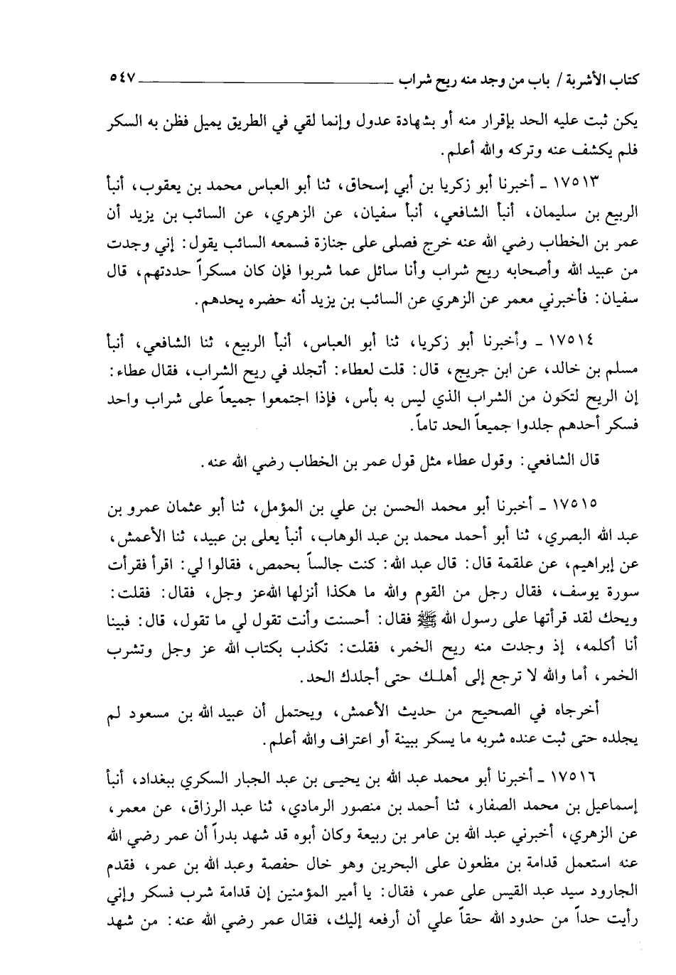 17513 - أَخْبَرَنَا أَبُو زَكَرِيَّا بْنُ أَبِي إِسْحَاقَ، ثنا أَبُو الْعَبَّاسِ مُحَمَّدُ بْنُ يَعْقُوبَ , أنبأ الرَّبِيعُ بْنُ سُلَيْمَانَ، أنبأ الشَّافِعِيُّ، أنبأ سُفْيَانُ، عَنِ الزُّهْرِيِّ، عَنِ السَّائِبِ بْنِ يَزِيدَ، أَنَّ عُمَرَ بْنَ الْخَطَّابِ، رَضِيَ اللهُ عَنْهُ خَرَجَ فَصَلَّى عَلَى جِنَازَةٍ , فَسَمِعَهُ السَّائِبُ يَقُولُ: §" إِنِّي وَجَدْتُ مِنْ عُبَيْدِ اللهِ وَأَصْحَابِهِ رِيحَ شَرَابٍ , وَأَنَا سَائِلٌ عَمَّا شَرِبُوا , فَإِنْ كَانَ مُسْكِرًا حَدَدْتُهُمْ قَالَ سُفْيَانُ: فَأَخْبَرَنِي مَعْمَرٌ، عَنِ الزُّهْرِيِّ، عَنِ السَّائِبِ بْنِ يَزِيدَ , أَنَّهُ حَضَرَهُ يَحُدُّهُمْ