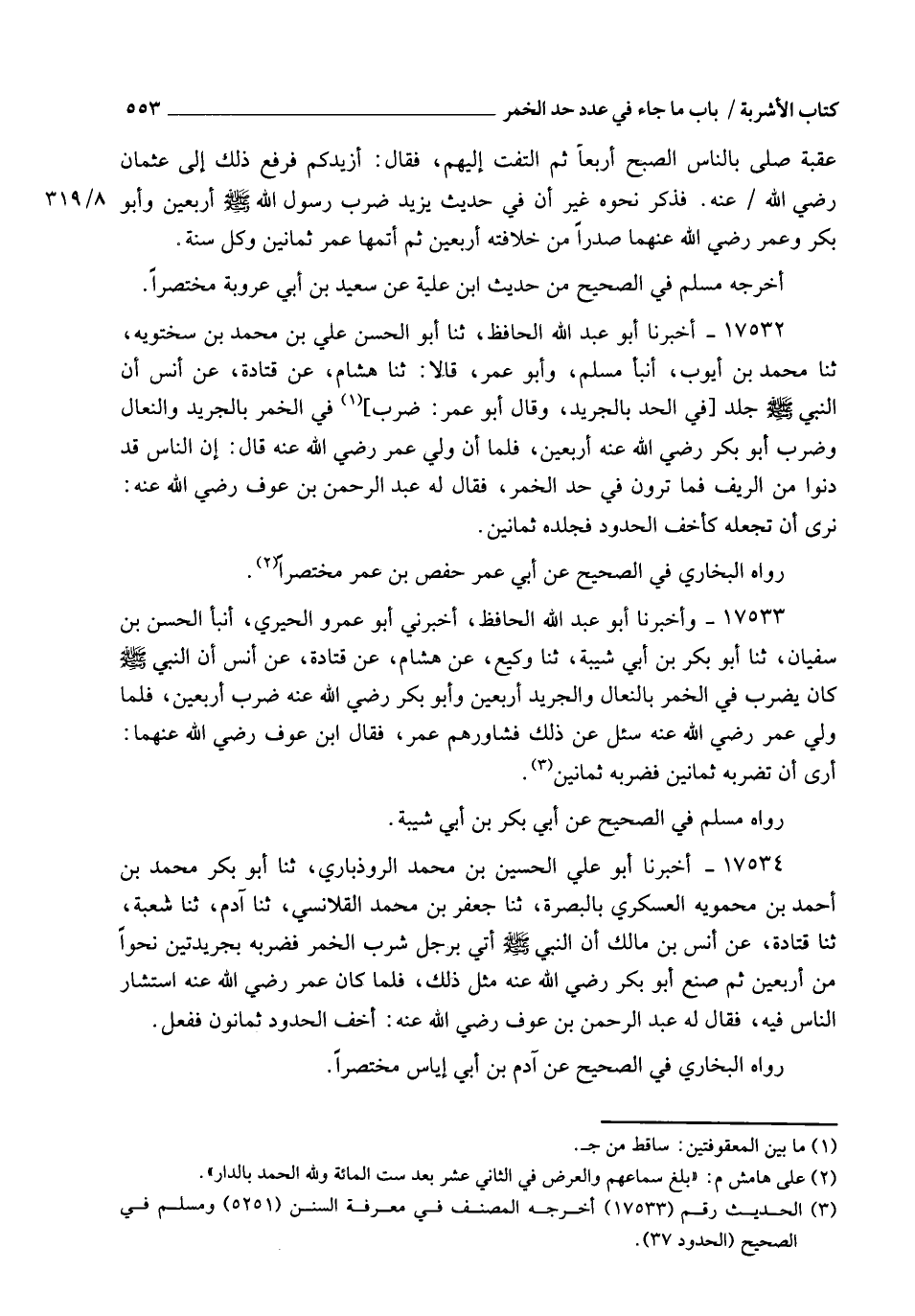 17533 - وَأَخْبَرَنَا أَبُو عَبْدِ اللهِ الْحَافِظُ، أَخْبَرَنِي أَبُو عَمْرٍو الْحِيرِيُّ، أنبأ الْحَسَنُ بْنُ سُفْيَانَ، ثنا أَبُو بَكْرِ بْنُ أَبِي شَيْبَةَ، ثنا وَكِيعٌ، عَنْ هِشَامٍ، عَنْ قَتَادَةَ، عَنْ أَنَسٍ، أَنَّ النَّبِيَّ صَلَّى اللهُ عَلَيْهِ وَسَلَّمَ §" كَانَ يَضْرِبُ فِي الْخَمْرِ بِالنِّعَالِ وَالْجَرِيدِ أَرْبَعِينَ , وَأَبُو بَكْرٍ رَضِيَ اللهُ عَنْهُ ضَرَبَ أَرْبَعِينَ , فَلَمَّا وَلِيَ عُمَرُ رَضِيَ اللهُ عَنْهُ سُئِلَ عَنْ ذَلِكَ , فَشَاوَرَهُمْ عُمَرُ فَقَالَ ابْنُ عَوْفٍ رَضِيَ اللهُ عَنْهُمَا: أَرَى أَنْ تَضْرِبَهُ ثَمَانِينَ , فَضَرَبَهُ ثَمَانِينَ " رَوَاهُ مُسْلِمٌ فِي الصَّحِيحِ عَنْ أَبِي بَكْرِ بْنِ أَبِي شَيْبَةَ