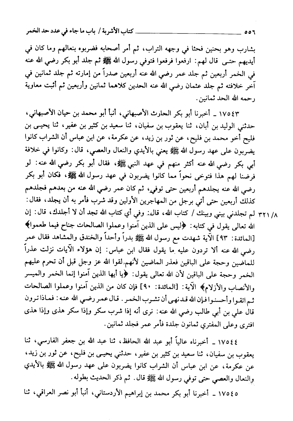 17543 - أَخْبَرَنَا أَبُو بَكْرِ بْنُ الْحَارِثِ الْأَصْبَهَانِيُّ، أنبأ أَبُو مُحَمَّدِ بْنُ حَيَّانَ الْأَصْبَهَانِيُّ، حَدَّثَنِي الْوَلِيدُ بْنُ أَبَانَ، ثنا يَعْقُوبُ بْنُ سُفْيَانَ، ثنا سَعِيدُ بْنُ كَثِيرِ بْنِ عُفَيْرٍ، ثنا يَحْيَى بْنُ فُلَيْحٍ أَخُو مُحَمَّدِ بْنِ فُلَيْحٍ، عَنْ ثَوْرِ بْنِ زَيْدٍ، عَنْ عِكْرِمَةَ، عَنِ ابْنِ عَبَّاسٍ، " §أَنَّ الشُّرَّابَ، كَانُوا يُضْرَبُونَ عَلَى عَهْدِ رَسُولِ اللهِ صَلَّى اللهُ عَلَيْهِ وَسَلَّمَ , يَعْنِي بِالْأَيْدِي وَالنِّعَالِ وَالْعِصِيِّ، قَالَ: وَكَانُوا فِي خِلَافَةِ أَبِي بَكْرٍ رَضِيَ اللهُ عَنْهُ أَكْثَرَ مِنْهُمْ فِي عَهْدِ النَّبِيِّ صَلَّى اللهُ عَلَيْهِ وَسَلَّمَ، فَقَالَ أَبُو بَكْرٍ رَضِيَ اللهُ عَنْهُ: لَوْ فَرَضْنَا لَهُمْ هَذَا , فَتَوَخَّى نَحْوًا مِمَّا كَانُوا يُضْرَبُونَ فِي عَهْدِ رَسُولِ اللهِ صَلَّى اللهُ عَلَيْهِ وَسَلَّمَ , فَكَانَ أَبُو بَكْرٍ رَضِيَ اللهُ عَنْهُ يَجْلِدُهُمْ أَرْبَعِينَ حَتَّى تُوُفِّيَ , ثُمَّ كَانَ عُمَرُ رَضِيَ اللهُ عَنْهُ مِنْ بَعْدِهِمْ فَجَلَدَهُمْ كَذَلِكَ أَرْبَعِينَ , حَتَّى أُتِيَ بِرَجُلٍ مِنَ الْمُهَاجِرِينَ الْأَوَّلِينَ وَقَدْ شَرِبَ فَأَمَرَ بِهِ أَنْ يُجْلَدَ، فَقَالَ: لِمَ تَجْلِدُنِي؟ بَيْنِي وَبَيْنَكَ كِتَابُ اللهِ، قَالَ: وَفِي أِيِّ كِتَابِ اللهِ تَجِدُ أَنْ لَا أَجْلِدَكَ؟ قَالَ: إِنَّ اللهَ تَعَالَى يَقُولُ فِي كِتَابِهِ: {لَيْسَ عَلَى الَّذِينَ آمَنُوا وَعَمِلُوا الصَّالِحَاتِ جُنَاحٌ فِيمَا طَعِمُوا} [المائدة: 93] الْآيَةَ , شَهِدْتُ مَعَ رَسُولِ اللهِ صَلَّى اللهُ عَلَيْهِ وَسَلَّمَ بَدْرًا وَأُحُدًا وَالْخَنْدَقَ وَالْمَشَاهِدَ، فَقَالَ عُمَرُ رَضِيَ اللهُ عَنْهُ: أَلَا تَرُدُّونَ عَلَيْهِ مَا يَقُولُ؟ فَقَالَ ابْنُ عَبَّاسٍ: إِنَّ هَؤُلَاءِ الْآيَاتِ نَزَلَتْ عُذْرًا لِلْمَاضِينَ , وَحُجَّةً عَلَى الْبَاقِينَ , فَعُذْرُ الْمَاضِينَ؛ لِأَنَّهُمْ لَقُوا اللهَ عَزَّ وَجَلَّ قَبْلَ أَنْ تُحَرَّمَ عَلَيْهِمُ الْخَمْرُ , وَحُجَّةً عَلَى الْبَاقِينَ؛ لِأَنَّ اللهَ تَعَالَى يَقُولُ: {يَا أَيُّهَا الَّذِينَ آمَنُوا إِنَّمَا الْخَمْرُ وَالْمَيْسِرُ وَالْأَنْصَابُ وَالْأَزْلَامُ} [المائدة: 90] الْآيَةَ، فَإِنْ كَانَ مِنَ الَّذِينَ آمَنُوا وَعَمِلُوا الصَّالِحَاتِ ثُمَّ اتَّقَوْا وَأَحْسَنُوا فَإِنَّ اللهَ قَدْ نَهَى أَنْ تُشْرَبَ الْخَمْرُ، قَالَ عُمَرُ رَضِيَ اللهُ عَنْهُ: فَمَاذَا تَرَوْنَ؟ قَالَ عَلِيُّ بْنُ أَبِي طَالِبٍ رَضِيَ اللهُ عَنْهُ: نَرَى أَنَّهُ إِذَا شَرِبَ سَكِرَ , وَإِذَا سَكِرَ هَذَى , وَإِذَا هَذَى افْتَرَى , وَعَلَى الْمُفْتَرِي ثَمَانُونَ جَلْدَةً , فَأَمَرَ عُمَرُ فَجُلِدَ ثَمَانِينَ