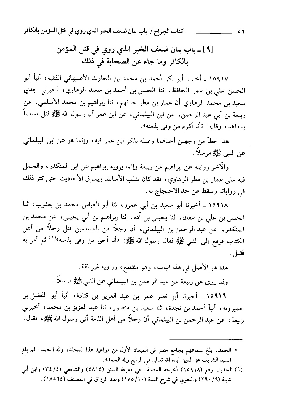 15918 - أَخْبَرَنَا أَبُو سَعِيدِ بْنُ أَبِي عَمْرٍو، ثنا أَبُو الْعَبَّاسِ مُحَمَّدُ بْنُ يَعْقُوبَ، ثنا الْحَسَنُ بْنُ عَلِيِّ بْنِ عَفَّانَ، ثنا يَحْيَى بْنُ آدَمَ، ثنا إِبْرَاهِيمُ بْنُ أَبِي يَحْيَى، عَنْ مُحَمَّدِ بْنِ الْمُنْكَدِرِ، عَنْ عَبْدِ الرَّحْمَنِ بْنِ الْبَيْلَمَانِيِّ، أَنَّ رَجُلًا مِنَ الْمُسْلِمِينَ قَتَلَ رَجُلًا مِنْ أَهْلِ الْكِتَابِ، فَرُفِعَ إِلَى النَّبِيِّ صَلَّى اللهُ عَلَيْهِ وَسَلَّمَ، فَقَالَ رَسُولُ اللهِ صَلَّى اللهُ عَلَيْهِ وَسَلَّمَ: " §أَنَا أَحَقُّ مَنْ وَفَى بِذِمَّتِهِ "، ثُمَّ أَمَرَ بِهِ فَقُتِلَ. هَذَا هُوَ الْأَصْلُ فِي هَذَا الْبَابِ، وَهُوَ مُنْقَطِعٌ وَرَاوِيهِ غَيْرُ ثِقَةٍ وَقَدْ رُوِيَ عَنْ رَبِيعَةَ، عَنْ عَبْدِ الرَّحْمَنِ بْنِ الْبَيْلَمَانِيِّ، عَنِ النَّبِيِّ صَلَّى اللهُ عَلَيْهِ وَسَلَّمَ، مُرْسَلًا