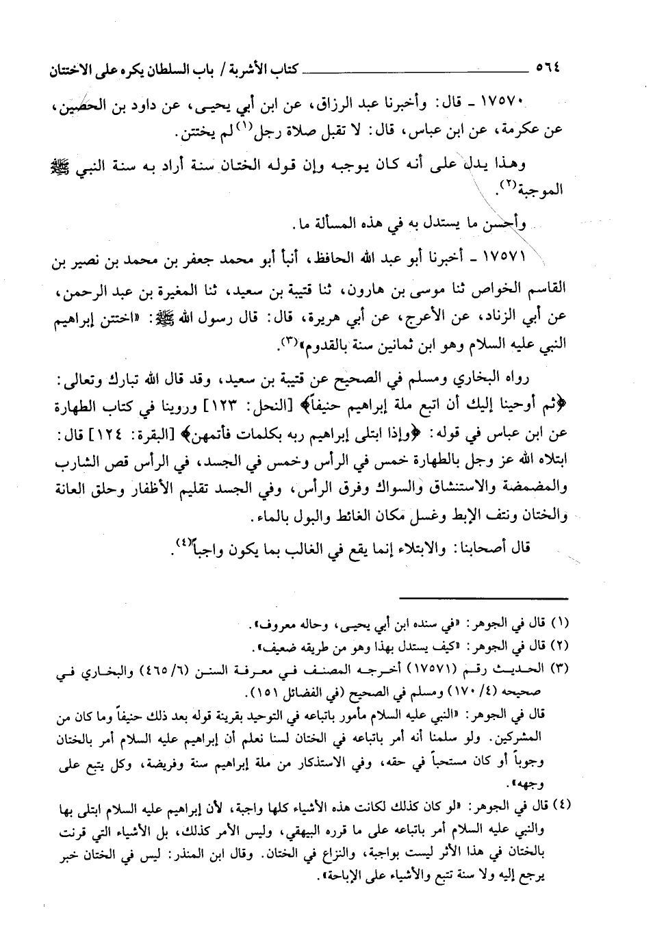 17570 - قَالَ: وَأَخْبَرَنَا عَبْدُ الرَّزَّاقِ، عَنِ ابْنِ أَبِي يَحْيَى، عَنْ دَاوُدَ بْنِ الْحُصَيْنِ، عَنْ عِكْرِمَةَ، عَنِ ابْنِ عَبَّاسٍ، قَالَ: §" لَا تُقْبَلُ صَلَاةُ رَجُلٍ لَمْ يَخْتَتِنْ " وَهَذَا يَدُلُّ عَلَى أَنَّهُ كَانَ يُوجِبُهُ , وَأَنَّ قَوْلَهُ: الْخِتَانُ سُنَّةٌ , أَرَادَ بِهِ سُنَّةَ النَّبِيِّ صَلَّى اللهُ عَلَيْهِ وَسَلَّمَ الْمُوجِبَةَ وَأَحْسَنُ مَا يُسْتَدَلُّ بِهِ فِي هَذِهِ الْمَسْأَلَةِ مَا