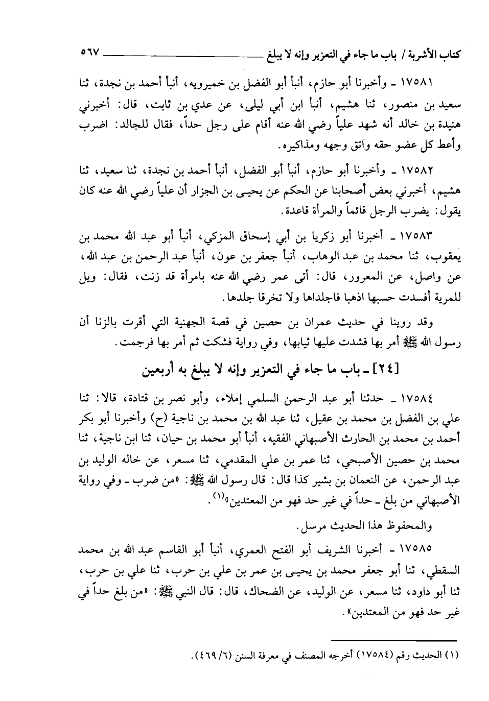 17584 - حَدَّثَنَا أَبُو عَبْدِ الرَّحْمَنِ السُّلَمِيُّ، إِمْلَاءً , وَأَبُو نَصْرِ بْنُ قَتَادَةَ , قَالَا: ثنا عَلِيُّ بْنُ الْفَضْلِ بْنِ مُحَمَّدِ بْنِ عَقِيلٍ، ثنا عَبْدُ اللهِ بْنُ مُحَمَّدِ بْنِ نَاجِيَةَ، ح وَأَخْبَرَنَا أَبُو بَكْرٍ أَحْمَدُ بْنُ مُحَمَّدِ بْنِ الْحَارِثِ الْأَصْبَهَانِيُّ الْفَقِيهُ , أنبأ أَبُو مُحَمَّدِ بْنُ حَيَّانَ، ثنا ابْنُ نَاجِيَةَ، ثنا مُحَمَّدُ بْنُ حُصَيْنٍ الْأَصْبَحِيُّ، ثنا عُمَرُ بْنُ عَلِيٍّ الْمُقَدَّمِيُّ، ثنا مِسْعَرٌ، عَنْ خَالِهِ الْوَلِيدِ بْنِ عَبْدِ الرَّحْمَنِ، عَنِ النُّعْمَانِ بْنِ بَشِيرٍ، كَذَا قَالَ: قَالَ رَسُولُ اللهِ صَلَّى اللهُ عَلَيْهِ وَسَلَّمَ: " §مَنْ ضَرَبَ " وَفِي رِوَايَةِ الْأَصْبَهَانِيِّ: " مَنْ بَلَغَ حَدًّا فِي غَيْرِ حَدٍّ فَهُوَ مِنَ الْمُعْتَدِينَ " وَالْمَحْفُوظُ هَذَا الْحَدِيثُ مُرْسَلٌ