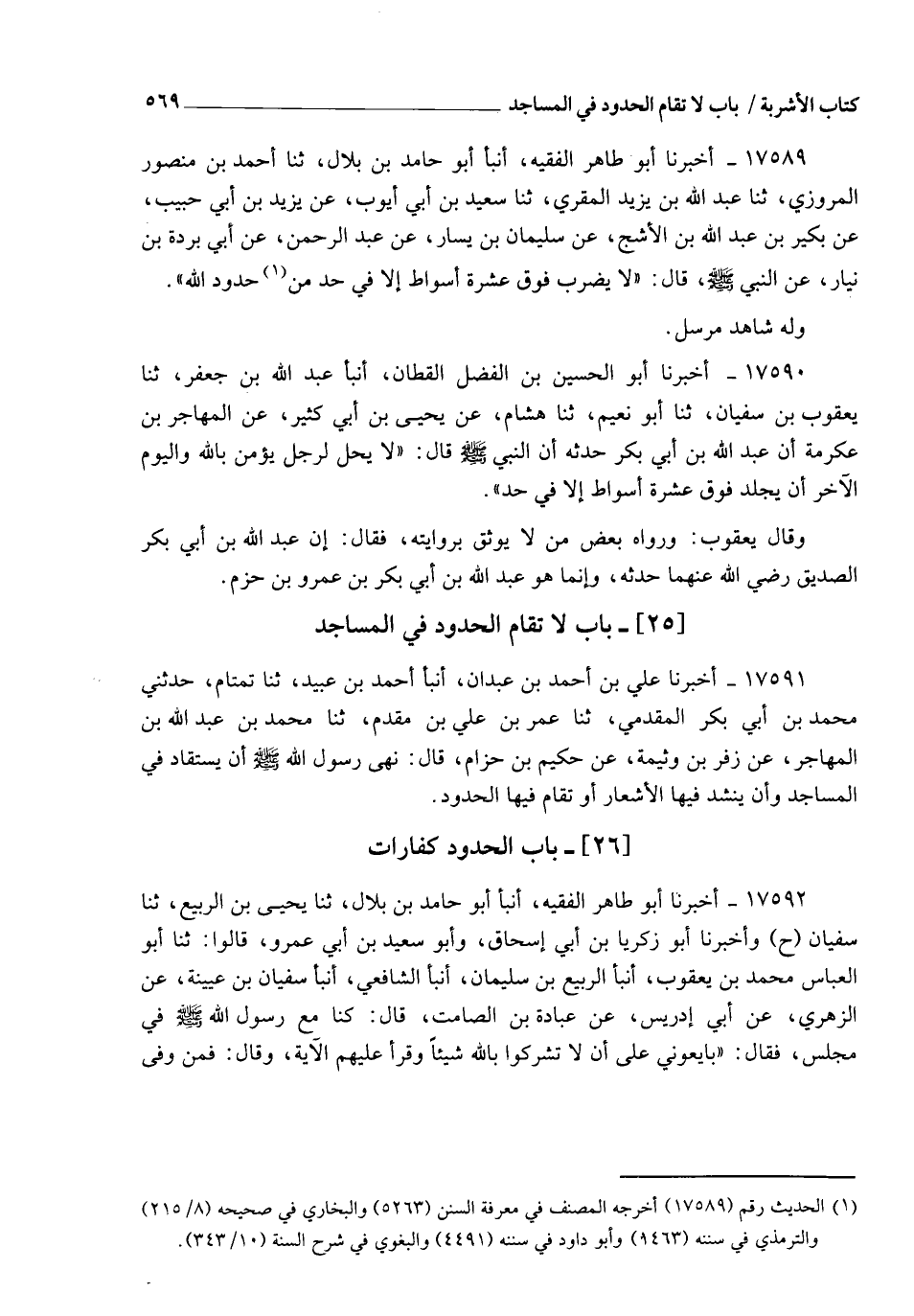 17589 - أَخْبَرَنَا أَبُو طَاهِرٍ الْفَقِيهُ، أنبأ أَبُو حَامِدِ بْنُ بِلَالٍ، ثنا أَحْمَدُ بْنُ مَنْصُورٍ الْمَرْوَزِيُّ، ثنا عَبْدُ اللهِ بْنُ يَزِيدَ الْمُقْرِئُ، ثنا سَعِيدُ بْنُ أَبِي أَيُّوبَ، عَنْ يَزِيدَ بْنِ أَبِي حَبِيبٍ، عَنْ بُكَيْرِ بْنِ عَبْدِ اللهِ بْنِ الْأَشَجِّ، عَنْ سُلَيْمَانَ بْنِ يَسَارٍ، عَنْ عَبْدِ الرَّحْمَنِ، عَنْ أَبِي بُرْدَةَ بْنِ نِيَارٍ، عَنِ النَّبِيِّ صَلَّى اللهُ عَلَيْهِ وَسَلَّمَ قَالَ: §" لَا يُضْرَبُ فَوْقَ عَشَرَةِ أَسْوَاطٍ إِلَّا فِي حَدٍّ مِنْ حُدُودِ اللهِ " وَلَهُ شَاهِدٌ مُرْسَلٌ