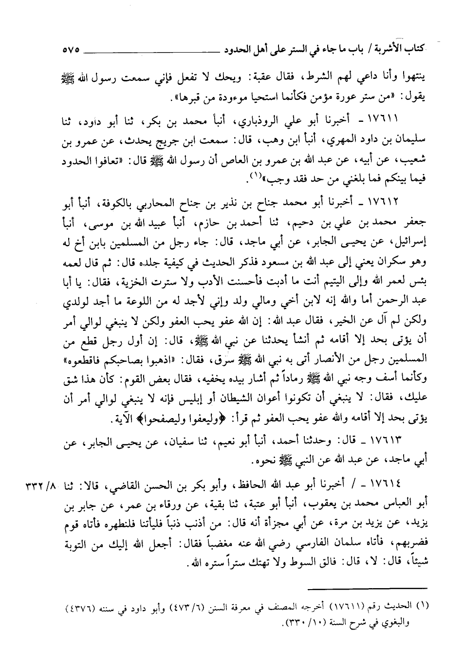 17611 - أَخْبَرَنَا أَبُو عَلِيٍّ الرُّوذْبَارِيُّ، أنبأ مُحَمَّدُ بْنُ بَكْرٍ، ثنا أَبُو دَاوُدَ، ثنا سُلَيْمَانُ بْنُ دَاوُدَ الْمَهْرِيُّ، أنبأ ابْنُ وَهْبٍ، قَالَ: سَمِعْتُ ابْنَ جُرَيْجٍ يُحَدِّثُ، عَنْ عَمْرِو بْنِ شُعَيْبٍ، عَنْ أَبِيهِ، عَنْ عَبْدِ اللهِ بْنِ عَمْرِو بْنِ الْعَاصِ، أَنَّ رَسُولَ اللهِ صَلَّى اللهُ عَلَيْهِ وَسَلَّمَ قَالَ: §" تَعَافَوَا الْحُدُودَ فِيمَا بَيْنَكُمْ , فَمَا بَلَغَنِي مِنْ حَدٍّ فَقَدْ وَجَبَ "