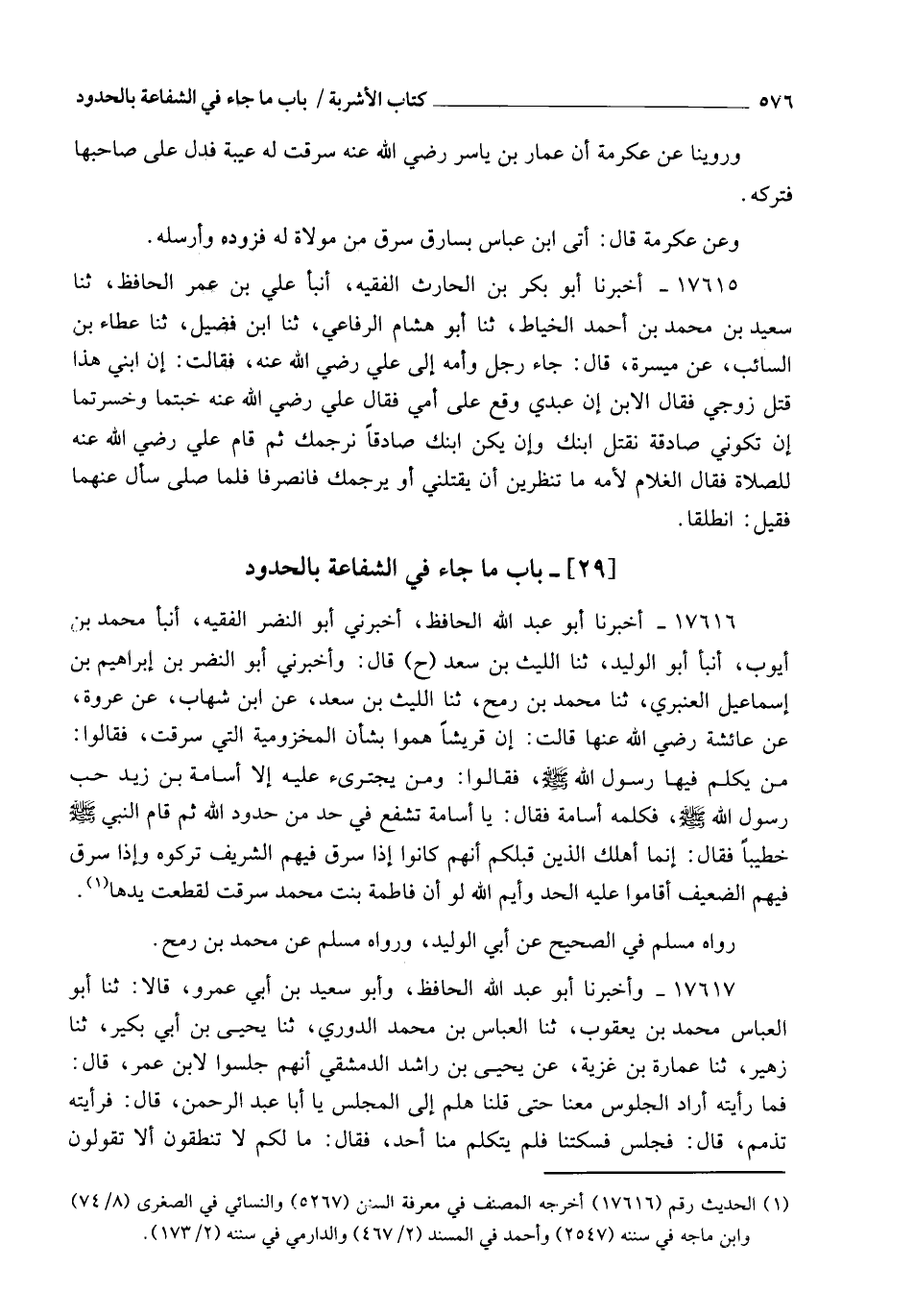 17616 - أَخْبَرَنَا أَبُو عَبْدِ اللهِ الْحَافِظُ، أَخْبَرَنِي أَبُو النَّضْرِ الْفَقِيهُ، أنبأ مُحَمَّدُ بْنُ أَيُّوبَ، أنبأ أَبُو الْوَلِيدِ، ثنا اللَّيْثُ بْنُ سَعْدٍ، ح قَالَ: وَأَخْبَرَنِي أَبُو النَّضْرِ بْنُ إِبْرَاهِيمَ بْنِ إِسْمَاعِيلَ الْعَنْبَرِيُّ، ثنا مُحَمَّدُ بْنُ رُمْحٍ، ثنا اللَّيْثُ بْنُ سَعْدٍ، عَنِ ابْنِ شِهَابٍ، عَنْ عُرْوَةَ، عَنْ عَائِشَةَ، رَضِيَ اللهُ عَنْهَا قَالَتْ: إِنَّ قُرَيْشًا هَمُّوا بِشَأْنِ الْمَخْزُومِيَّةِ الَّتِي سَرَقَتْ فَقَالُوا: مَنْ يُكَلِّمُ فِيهَا رَسُولَ اللهِ صَلَّى اللهُ عَلَيْهِ وَسَلَّمَ؟ فَقَالُوا: وَمَنْ يَجْتَرِئُ عَلَيْهِ إِلَّا أُسَامَةُ بْنُ زَيْدٍ حِبُّ رَسُولِ اللهِ صَلَّى اللهُ عَلَيْهِ وَسَلَّمَ , فَكَلَّمَهُ أُسَامَةُ , فَقَالَ: " يَا أُسَامَةُ، §تَشْفَعُ فِي حَدٍّ مِنْ حُدُودِ اللهِ " , ثُمَّ قَامَ النَّبِيُّ صَلَّى اللهُ عَلَيْهِ وَسَلَّمَ خَطِيبًا، فَقَالَ: " إِنَّمَا أَهْلَكَ الَّذِينَ قَبْلَكُمْ أَنَّهُمْ كَانُوا إِذَا سَرَقَ فِيهُمُ الشَّرِيفُ تَرَكُوهُ , وَإِذَا سَرَقَ فِيهُمُ الضَّعِيفُ أَقَامُوا عَلَيْهِ الْحَدَّ , وَايْمُ اللهِ لَوْ أَنَّ فَاطِمَةَ بِنْتَ مُحَمَّدٍ سَرَقَتْ لَقَطَعْتُ يَدَهَا " رَوَاهُ مُسْلِمٌ فِي الصَّحِيحِ عَنْ أَبِي الْوَلِيدِ , وَرَوَاهُ مُسْلِمٌ عَنْ مُحَمَّدِ بْنِ رُمْحٍ