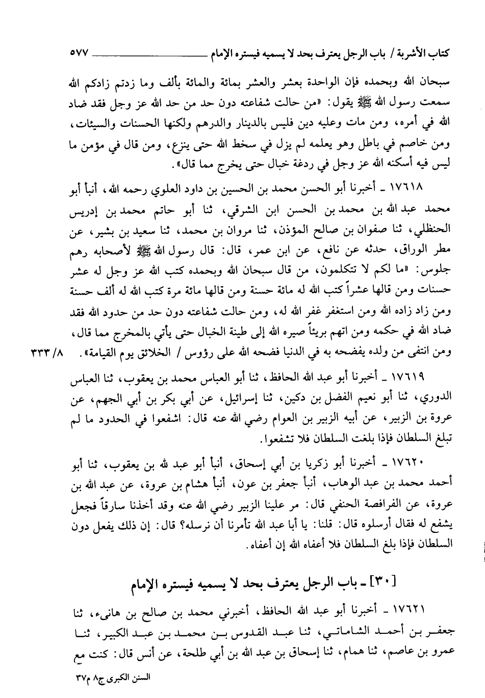 17619 - أَخْبَرَنَا أَبُو عَبْدِ اللهِ الْحَافِظُ، ثنا أَبُو الْعَبَّاسِ مُحَمَّدُ بْنُ يَعْقُوبَ , ثنا الْعَبَّاسُ الدُّورِيُّ، ثنا أَبُو نُعَيْمٍ الْفَضْلُ بْنُ دُكَيْنٍ، ثنا إِسْرَائِيلُ، عَنْ أَبِي بَكْرِ بْنِ أَبِي الْجَهْمِ، عَنْ عُرْوَةَ بْنِ الزُّبَيْرِ، عَنْ أَبِيهِ الزُّبَيْرِ بْنِ الْعَوَّامِ، رَضِيَ اللهُ عَنْهُ، قَالَ: §" اشْفَعُوا فِي الْحُدُودِ مَا لَمْ تَبْلُغِ السُّلْطَانَ , فَإِذَا بَلَغَتِ السُّلْطَانَ فَلَا تَشْفَعُوا "