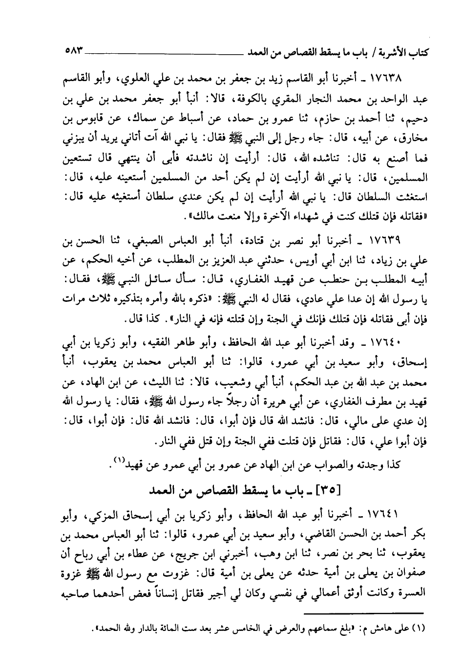 17640 - وَقَدْ أَخْبَرَنَا أَبُو عَبْدِ اللهِ الْحَافِظُ، وَأَبُو طَاهِرٍ الْفَقِيهُ , وَأَبُو زَكَرِيَّا بْنُ أَبِي إِسْحَاقَ , وَأَبُو سَعِيدِ بْنُ أَبِي عَمْرٍو، قَالُوا: ثنا أَبُو الْعَبَّاسِ مُحَمَّدُ بْنُ يَعْقُوبَ , أنبأ مُحَمَّدُ بْنُ عَبْدِ اللهِ بْنِ عَبْدِ الْحَكَمِ، أنبأ أَبِي وَشُعَيْبٌ، قَالَا: ثنا اللَّيْثُ، عَنِ ابْنِ الْهَادِ، عَنْ قُهَيْدِ بْنِ مُطَرِّفٍ الْغِفَارِيِّ، عَنْ أَبِي هُرَيْرَةَ، أَنَّ رَجُلًا جَاءَ رَسُولَ اللهِ صَلَّى اللهُ عَلَيْهِ وَسَلَّمَ فَقَالَ: يَا رَسُولَ اللهِ إِنْ عُدِيَ عَلَى مَالِي؟ قَالَ: " فَانْشُدِ اللهَ" قَالَ: فَإِنْ أَبَوْا؟ قَالَ: " فَانْشُدِ اللهَ" قَالَ: فَإِنْ أَبَوْا؟ قَالَ: " فَانْشُدِ اللهَ" قَالَ: فَإِنْ أَبَوْا عَلَيَّ، قَالَ: §" فَقَاتِلْ , فَإِنْ قُتِلْتَ فَفِي الْجَنَّةِ , وَإِنْ قُتِلَ فَفِي النَّارِ" كَذَا وَجَدْتُهُ , وَالصَّوَابُ: عَنِ ابْنِ الْهَادِ، عَنْ عَمْرِو بْنِ أَبِي عَمْرٍو، عَنْ قُهَيْدٍ