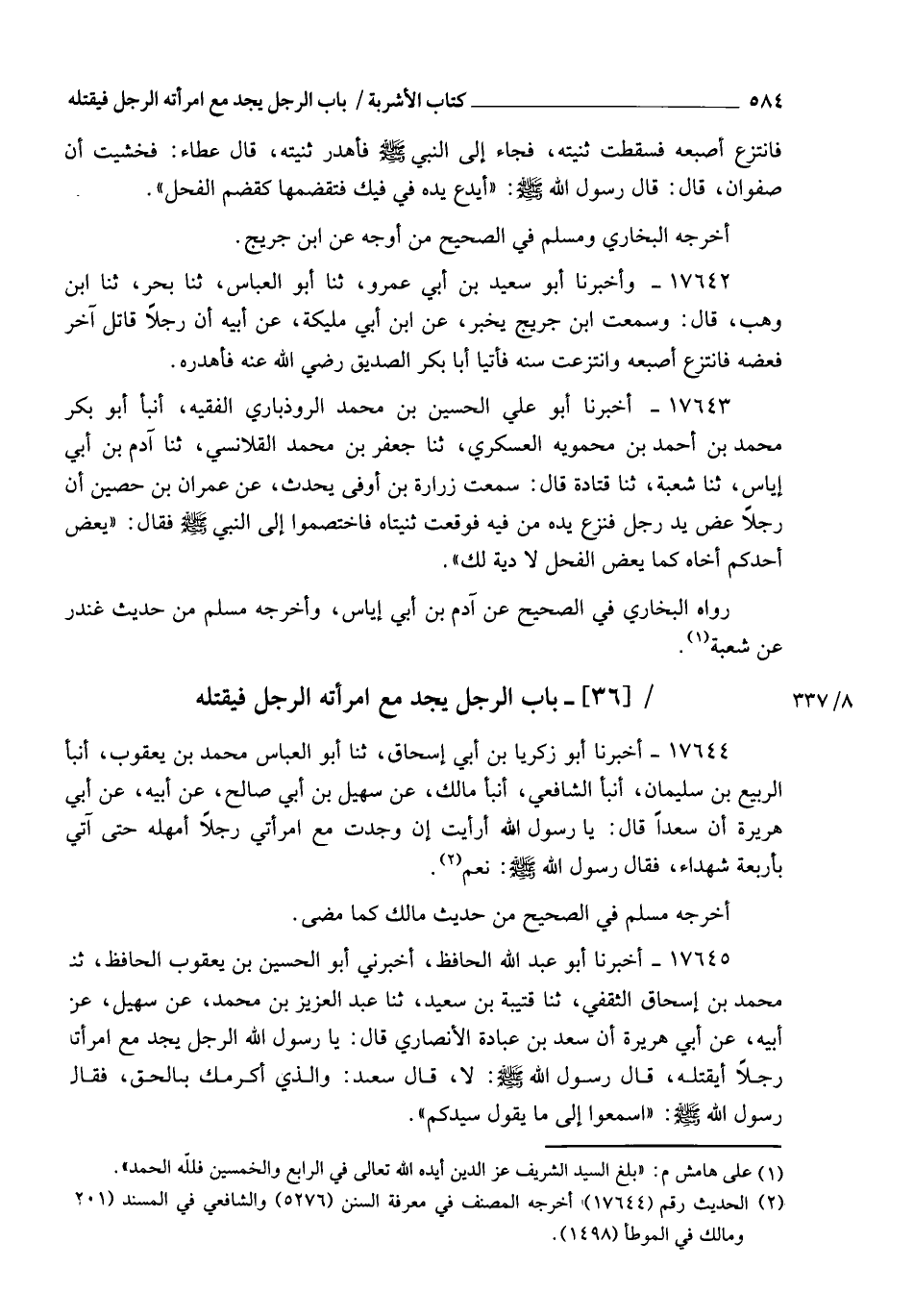 17643 - أَخْبَرَنَا أَبُو عَلِيٍّ الْحُسَيْنُ بْنُ مُحَمَّدٍ الرُّوذْبَارِيُّ الْفَقِيهُ، أنبأ أَبُو بَكْرٍ مُحَمَّدُ بْنُ أَحْمَدَ بْنِ مَحْمَوَيْهِ الْعَسْكَرِيُّ , ثنا جَعْفَرُ بْنُ مُحَمَّدٍ الْقَلَانِسِيُّ، ثنا آدَمُ بْنُ أَبِي إِيَاسٍ، ثنا شُعْبَةُ، ثنا قَتَادَةُ، قَالَ: سَمِعْتُ زُرَارَةَ بْنَ أَوْفَى يُحَدِّثُ، عَنْ عِمْرَانَ بْنِ حُصَيْنٍ، أَنَّ رَجُلًا عَضَّ يَدَ رَجُلٍ فَنَزَعَ يَدَهُ مِنْ فِيهِ فَوَقَعَتْ ثَنِيَّتَاهُ , فَاخْتَصَمُوا إِلَى النَّبِيِّ صَلَّى اللهُ عَلَيْهِ وَسَلَّمَ فَقَالَ: §" يَعَضُّ أَحَدُكُمْ أَخَاهُ كَمَا يَعَضُّ الْفَحْلُ , لَا دِيَةَ لَكَ " رَوَاهُ الْبُخَارِيُّ فِي الصَّحِيحِ عَنْ آدَمَ بْنِ أَبِي إِيَاسٍ , وَأَخْرَجَهُ مُسْلِمٌ مِنْ حَدِيثِ غُنْدَرٍ عَنْ شُعْبَةَ