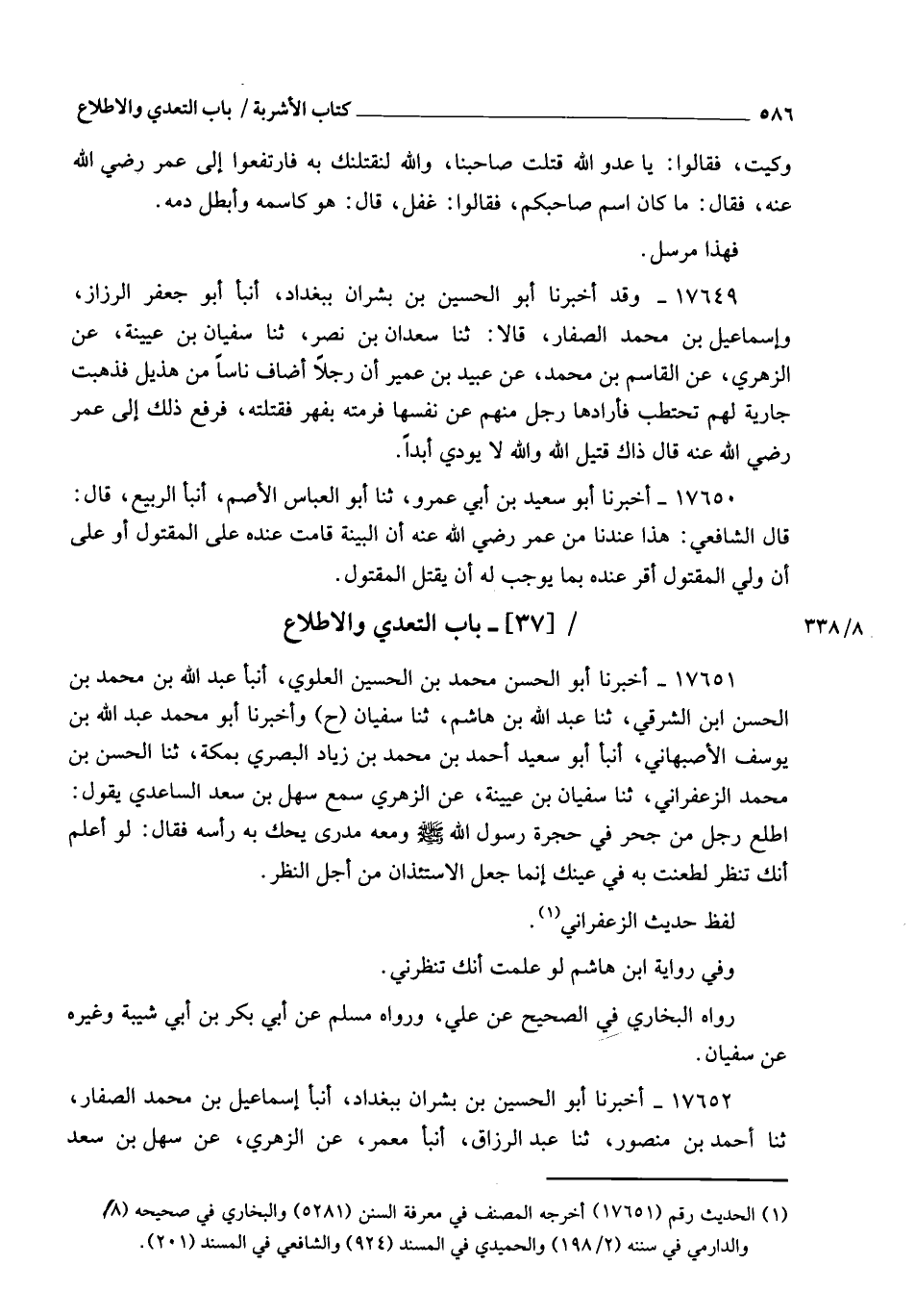 17651 - أَخْبَرَنَا أَبُو الْحَسَنِ مُحَمَّدُ بْنُ الْحُسَيْنِ الْعَلَوِيُّ , أنبأ عَبْدُ اللهِ بْنُ مُحَمَّدِ بْنِ الْحَسَنِ بْنِ الشَّرْقِيِّ، ثنا عَبْدُ اللهِ بْنُ هَاشِمٍ، ثنا سُفْيَانُ، ح وَأَخْبَرَنَا أَبُو مُحَمَّدٍ عَبْدُ اللهِ بْنُ يُوسُفَ الْأَصْبَهَانِيُّ، أنبأ أَبُو سَعِيدٍ أَحْمَدُ بْنُ مُحَمَّدِ بْنِ زِيَادٍ الْبَصْرِيُّ بِمَكَّةَ , ثنا الْحَسَنُ بْنُ مُحَمَّدٍ الزَّعْفَرَانِيُّ، ثنا سُفْيَانُ بْنُ عُيَيْنَةَ، عَنِ الزُّهْرِيِّ، سَمِعَ سَهْلَ بْنَ سَعْدٍ السَّاعِدِيَّ، يَقُولُ: اطَّلَعَ رَجُلٌ مِنْ جُحْرٍ فِي حُجْرَةِ رَسُولِ اللهِ صَلَّى اللهُ عَلَيْهِ وَسَلَّمَ , وَمَعَهُ مِدْرًى يَحُكُّ بِهِ رَأْسَهُ، فَقَالَ: §" لَوْ أَعْلَمُ أَنَّكَ تَنْظُرُ لَطَعَنْتُ بِهِ فِي عَيْنِكَ , إِنَّمَا جُعِلَ الِاسْتِئْذَانُ مِنْ أَجْلِ النَّظَرِ " لَفْظُ حَدِيثِ الزَّعْفَرَانِيِّ , وَفِي رِوَايَةِ ابْنِ هَاشِمٍ: " لَوْ عَلِمْتُ أَنَّكَ تَنْظُرُنِي " رَوَاهُ الْبُخَارِيُّ فِي الصَّحِيحِ عَنْ عَلِيٍّ , وَرَوَاهُ مُسْلِمٌ عَنْ أَبِي بَكْرِ بْنِ أَبِي شَيْبَةَ وَغَيْرِهِ، عَنْ سُفْيَانَ