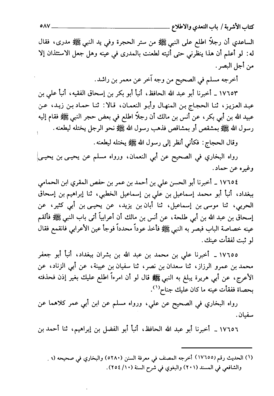 17653 - أَخْبَرَنَا أَبُو عَبْدِ اللهِ الْحَافِظُ، أنبأ أَبُو بَكْرِ بْنُ إِسْحَاقَ الْفَقِيهُ، أنبأ عَلِيُّ بْنُ عَبْدِ الْعَزِيزِ، ثنا الْحَجَّاجُ بْنُ الْمِنْهَالِ، وَأَبُو النُّعْمَانِ، قَالَا: ثنا حَمَّادُ بْنُ زَيْدٍ، عَنْ عُبَيْدِ اللهِ بْنِ أَبِي بَكْرٍ، عَنْ أَنَسِ بْنِ مَالِكٍ، أَنَّ رَجُلًا اطَّلَعَ فِي بَعْضِ حُجَرِ النَّبِيِّ صَلَّى اللهُ عَلَيْهِ وَسَلَّمَ , §" فَقَامَ إِلَيْهِ رَسُولُ اللهِ صَلَّى اللهُ عَلَيْهِ وَسَلَّمَ بِمِشْقَصٍ , أَوْ بِمَشَاقِصَ , فَذَهَبَ رَسُولُ اللهِ صَلَّى اللهُ عَلَيْهِ وَسَلَّمَ نَحْوَ الرَّجُلِ يَخْتِلُهُ لِيَطْعَنَهُ " وَقَالَ الْحَجَّاجُ: فَكَأَنِّي أَنْظُرُ إِلَى رَسُولِ اللهِ صَلَّى اللهُ عَلَيْهِ وَسَلَّمَ يَخْتِلُهُ لِيَطْعَنَهُ رَوَاهُ الْبُخَارِيُّ فِي الصَّحِيحِ عَنْ أَبِي النُّعْمَانِ , وَرَوَاهُ مُسْلِمٌ عَنْ يَحْيَى بْنِ يَحْيَى وَغَيْرِهِ، عَنْ حَمَّادٍ