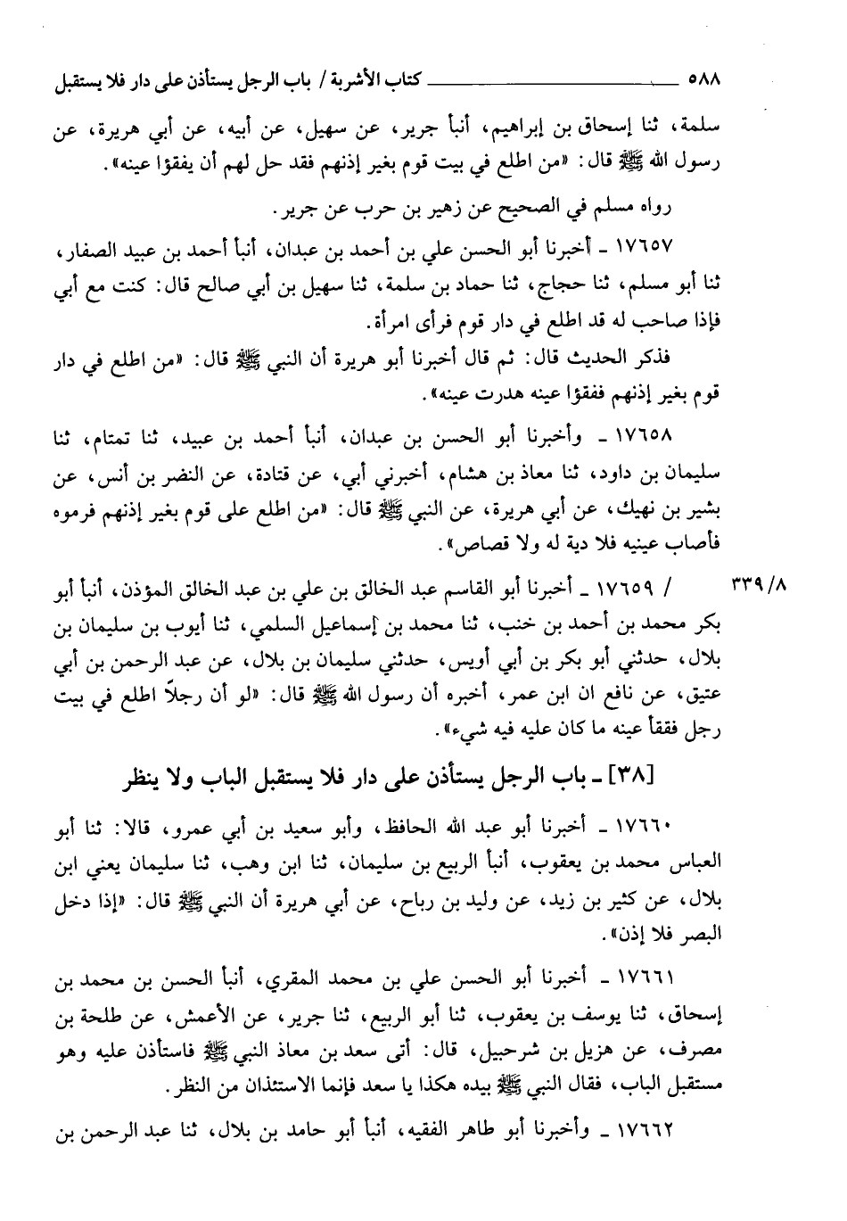 17657 - أَخْبَرَنَا أَبُو الْحَسَنِ عَلِيُّ بْنُ أَحْمَدَ بْنِ عَبْدَانَ , أنبأ أَحْمَدُ بْنُ عُبَيْدٍ الصَّفَّارُ، ثنا أَبُو مُسْلِمٍ، ثنا الْحَجَّاجُ، ثنا حَمَّادُ بْنُ سَلَمَةَ، ثنا سُهَيْلُ بْنُ أَبِي صَالِحٍ، قَالَ: كُنْتُ مَعَ أَبِي فَإِذَا صَاحِبٌ لَهُ قَدِ اطَّلَعَ فِي دَارِ قَوْمٍ فَرَأَى امْرَأَةً , فَذَكَرَ الْحَدِيثَ، قَالَ: ثُمَّ قَالَ: أَخْبَرَنَا أَبُو هُرَيْرَةَ , أَنَّ النَّبِيَّ صَلَّى اللهُ عَلَيْهِ وَسَلَّمَ قَالَ: §" مَنِ اطَّلَعَ فِي دَارِ قَوْمٍ بِغَيْرِ إِذْنِهِمْ فَفَقَئُوا عَيْنَهُ هُدِرَتْ عَيْنُهُ "