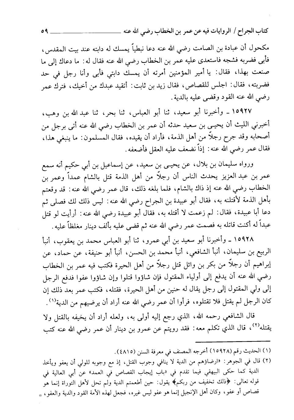 15928 - وَأَخْبَرَنَا أَبُو سَعِيدِ بْنُ أَبِي عَمْرٍو، ثنا أَبُو الْعَبَّاسِ مُحَمَّدُ بْنُ يَعْقُوبَ، أنبأ الرَّبِيعُ بْنُ سُلَيْمَانَ، أنبأ الشَّافِعِيُّ، أنبأ مُحَمَّدُ بْنُ الْحَسَنِ، أنبأ أَبُو حَنِيفَةَ، عَنْ حَمَّادٍ، عَنْ إِبْرَاهِيمَ، أَنَّ رَجُلًا مِنْ بَكْرِ بْنِ وَائِلٍ قَتَلَ رَجُلًا مِنْ أَهْلِ الْحِيرَةِ فَكَتَبَ فِيهِ عُمَرُ بْنُ الْخَطَّابِ رَضِيَ اللهُ عَنْهُ أَنْ §يُدْفَعَ إِلَى أَوْلِيَاءِ الْمَقْتُولِ، فَإِنْ شَاءُوا قَتَلُوا وَإِنْ شَاءُوا عَفَوْا. فَدُفِعَ الرَّجُلُ إِلَى وَلِيِّ الْمَقْتُولِ، إِلَى رَجُلٍ يُقَالُ لَهُ: حُنَيْنٌ مِنْ أَهْلِ الْحِيرَةِ فَقَتَلَهُ. فَكَتَبَ عُمَرُ بَعْدَ ذَلِكَ: إِنْ كَانَ الرَّجُلُ لَمْ يُقْتَلْ فَلَا تَقْتُلُوهُ. فَرَأَوْا أَنَّ عُمَرَ رَضِيَ اللهُ عَنْهُ أَرَادَ أَنْ يُرَضِّيَهُمْ مِنَ الدِّيَةِ. قَالَ الشَّافِعِيُّ رَحِمَهُ اللهُ: " الَّذِي رَجَعَ إِلَيْهِ أَوْلَى بِهِ، وَلَعَلَّهُ أَرَادَ أَنْ يُخِيفَهُ بِالْقَتْلِ وَلَا يَقْتُلُهُ ". قَالَ الَّذِي تَكَلَّمَ مَعَهُ: فَقَدْ رَوَيْتُمْ عَنْ عَمْرِو بْنِ دِينَارٍ أَنَّ عُمَرَ رَضِيَ اللهُ عَنْهُ كَتَبَ -[60]- فِي مُسْلِمٍ قَتَلَ نَصْرَانِيًّا: إِنْ كَانَ الْقَاتِلُ قَتَّالًا فَاقْتُلُوهُ، وَإِنْ كَانَ غَيْرَ قَتَّالٍ فَذَرُوهُ وَلَا تَقْتُلُوهُ؟ قَالَ الشَّافِعِيُّ: قَدْ رُوِّينَاهُ، فَاتَّبِعْ عُمَرَ رَضِيَ اللهُ عَنْهُ كَمَا قَالَ، فَأَنْتَ لَا تَتَّبِعُهُ فِيمَا قَالَ. قَالَ: فَيَثْبُتُ عِنْدَكُمْ عَنْ عُمَرَ رَضِيَ اللهُ عَنْهُ مِنْ هَذَا شَيْءٌ؟ قَالَ الشَّافِعِيُّ: قُلْنَا: وَلَا حَرْفٌ، وَهَذِهِ أَحَادِيثُ مُنْقَطِعَاتٌ، أَوْ ضِعَافٌ، أَوْ تَجْمَعُ الِانْقِطَاعَ وَالضَّعْفَ جَمِيعًا