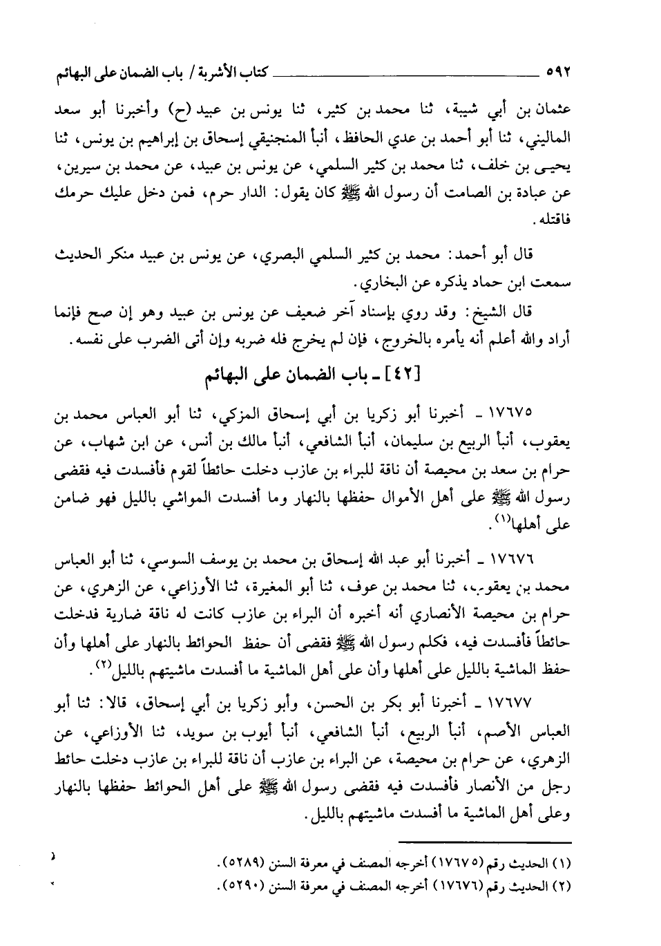 17677 - أَخْبَرَنَا أَبُو بَكْرِ بْنُ الْحَسَنِ، وَأَبُو زَكَرِيَّا بْنُ أَبِي إِسْحَاقَ , قَالَا: ثنا أَبُو الْعَبَّاسِ الْأَصَمُّ، أنبأ الرَّبِيعُ، أنبأ الشَّافِعِيُّ، أنبأ أَيُّوبُ بْنُ سُوَيْدٍ، ثنا الْأَوْزَاعِيُّ، عَنِ الزُّهْرِيِّ، عَنْ حَرَامِ بْنِ مُحَيِّصَةَ، عَنِ الْبَرَاءِ بْنِ عَازِبٍ، أَنَّ نَاقَةً، لِلْبَرَاءِ بْنِ عَازِبٍ دَخَلَتْ حَائِطَ رَجُلٍ مِنَ الْأَنْصَارِ فَأَفْسَدَتْ فِيهِ , فَقَضَى رَسُولُ اللهِ صَلَّى اللهُ عَلَيْهِ وَسَلَّمَ §عَلَى أَهْلِ الْحَوَائِطِ حِفْظُهَا بِالنَّهَارِ , وَعَلَى أَهْلِ الْمَاشِيَةِ مَا أَفْسَدَتْ مَاشِيَتُهُمْ بِاللَّيْلِ -[593]-