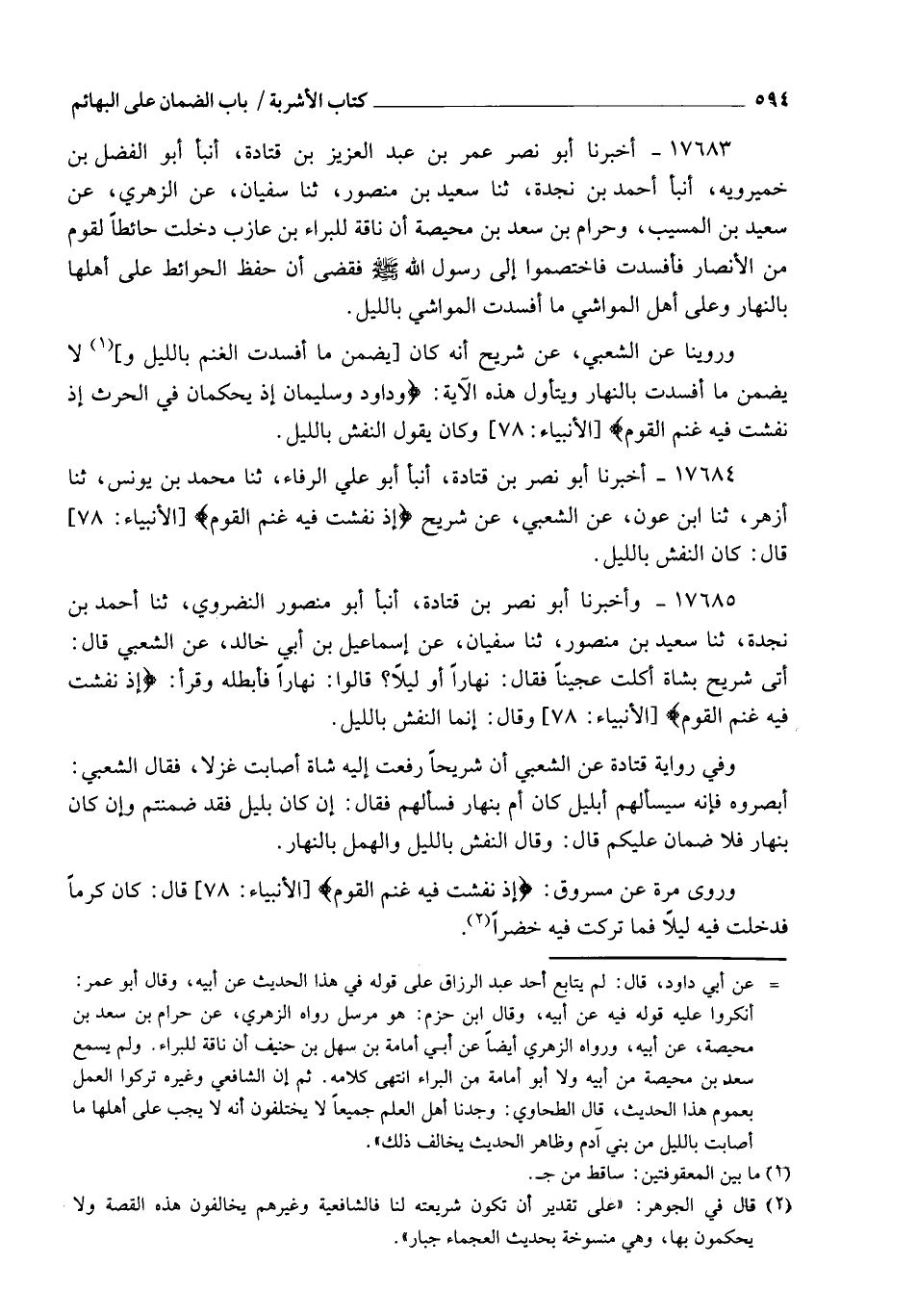 17683 - أَخْبَرَنَا أَبُو نَصْرٍ عُمَرُ بْنُ عَبْدِ الْعَزِيزِ بْنِ قَتَادَةَ , أنبأ أَبُو الْفَضْلِ بْنُ خَمِيرَوَيْهِ، أنبأ أَحْمَدُ بْنُ نَجْدَةَ، ثنا سَعِيدُ بْنُ مَنْصُورٍ، ثنا سُفْيَانُ، عَنِ الزُّهْرِيِّ، عَنْ سَعِيدِ بْنِ الْمُسَيِّبِ، وَحَرَامِ بْنِ سَعْدِ بْنِ مُحَيِّصَةَ، أَنَّ نَاقَةً لِلْبَرَاءِ بْنِ عَازِبٍ دَخَلَتْ حَائِطًا لِقَوْمٍ مِنَ الْأَنْصَارِ فَأَفْسَدَتْ , فَاخْتَصَمُوا إِلَى رَسُولِ اللهِ صَلَّى اللهُ عَلَيْهِ وَسَلَّمَ فَقَضَى §" أَنَّ حِفْظَ الْحَوَائِطِ عَلَى أَهْلِهَا بِالنَّهَارِ , وَعَلَى أَهْلِ الْمَوَاشِي مَا أَفْسَدَتِ الْمَوَاشِي بِاللَّيْلِ " وَرُوِّينَا عَنِ الشَّعْبِيِّ عَنْ شُرَيْحٍ: أَنَّهُ كَانَ يَضْمَنُ مَا أَفْسَدَتِ الْغَنَمُ بِاللَّيْلِ , وَلَا يَضْمَنُ مَا أَفْسَدَتْ بِالنَّهَارِ , وَيَتَأَوَّلُ هَذِهِ الْآيَةَ: {وَدَاوُدَ وَسُلَيْمَانَ إِذْ يَحْكُمَانِ فِي الْحَرْثِ إِذْ نَفَشَتْ فِيهِ غَنَمُ الْقَوْمِ} , وَكَانَ يَقُولُ: النَّفْشُ بِاللَّيْلِ