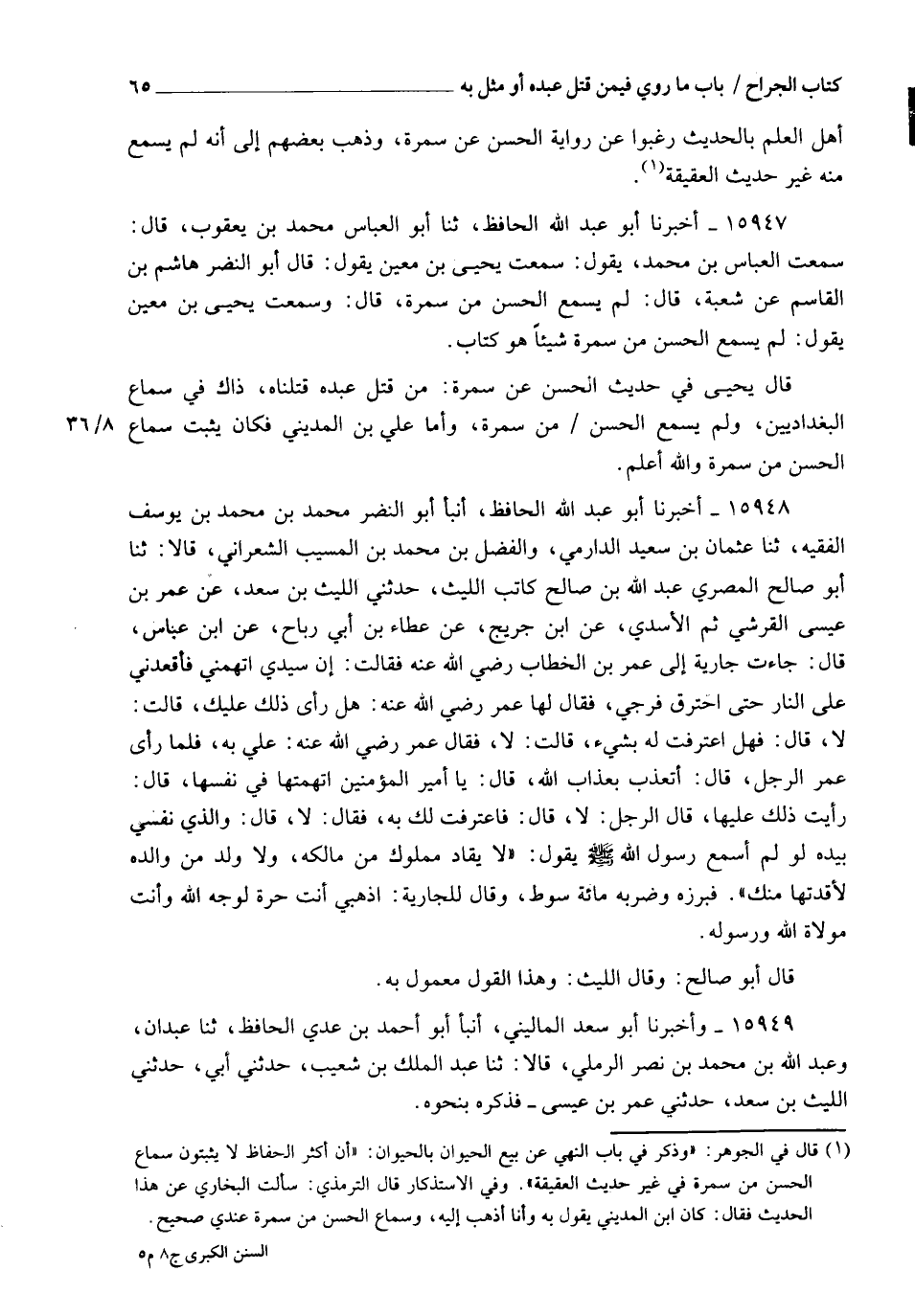 15948 - أَخْبَرَنَا أَبُو عَبْدِ اللهِ الْحَافِظُ، أنبأ أَبُو النَّضْرِ مُحَمَّدُ بْنُ مُحَمَّدِ بْنِ يُوسُفَ الْفَقِيهُ، ثنا عُثْمَانُ بْنُ سَعِيدٍ الدَّارِمِيُّ، وَالْفَضْلُ بْنُ مُحَمَّدِ بْنِ الْمُسَيَّبِ الشَّعْرَانِيُّ، قَالَا: ثنا أَبُو صَالِحٍ الْمِصْرِيُّ عَبْدُ اللهِ بْنُ صَالِحٍ، كَاتِبُ اللَّيْثِ، حَدَّثَنِي اللَّيْثُ بْنُ سَعْدٍ، عَنْ عُمَرَ بْنِ عِيسَى الْقُرَشِيِّ، ثُمَّ الْأَسَدِيِّ، عَنِ ابْنِ جُرَيْجٍ، عَنْ عَطَاءِ بْنِ أَبِي رَبَاحٍ، عَنِ ابْنِ عَبَّاسٍ، قَالَ: جَاءَتْ جَارِيَةٌ إِلَى عُمَرَ بْنِ الْخَطَّابِ رَضِيَ اللهُ عَنْهُ فَقَالَتْ: إِنَّ سَيِّدِي اتَّهَمَنِي فَأَقْعَدَنِي عَلَى النَّارِ حَتَّى احْتَرَقَ فَرْجِي. فَقَالَ لَهَا عُمَرُ رَضِيَ اللهُ عَنْهُ: هَلْ رَأَى ذَلِكَ عَلَيْكِ؟ قَالَتْ: لَا. قَالَ: فَهَلِ اعْتَرَفْتِ لَهُ بِشَيْءٍ؟ قَالَتْ: لَا. فَقَالَ عُمَرُ رَضِيَ اللهُ عَنْهُ: " " عَلَيَّ بِهِ " ". فَلَمَّا رَأَى عُمَرُ الرَّجُلَ قَالَ: " " أَتُعَذِّبُ بِعَذَابِ اللهِ؟ " " قَالَ: يَا أَمِيرَ الْمُؤْمِنِينَ اتَّهَمْتُهَا فِي نَفْسِهَا. قَالَ: " " رَأَيْتَ ذَلِكَ عَلَيْهَا؟ " " قَالَ الرَّجُلُ: لَا. قَالَ: " " فَاعْتَرَفَتْ لَكَ بِهِ؟ " " فَقَالَ: لَا. قَالَ: وَالَّذِي نَفْسِي بِيَدِهِ، لَوْ لَمْ أَسْمَعْ رَسُولَ اللهِ صَلَّى اللهُ عَلَيْهِ وَسَلَّمَ يَقُولُ: " " §لَا يُقَادُ مَمْلُوكٌ مِنْ مَالِكِهِ، وَلَا وَلَدٌ مِنْ وَالِدِهِ لَأَقَدْتُهَا مِنْكَ " ". فَبَرَزَهُ وَضَرَبَهُ مِائَةَ سَوْطٍ، وَقَالَ لِلْجَارِيَةِ: اذْهَبِي فَأَنْتِ حُرَّةٌ لِوَجْهِ اللهِ، وَأَنْتِ مَوْلَاةُ اللهِ وَرَسُولِهِ. قَالَ أَبُو صَالِحٍ: وَقَالَ اللَّيْثُ: وَهَذَا الْقَوْلُ مَعْمُولٌ بِهِ،